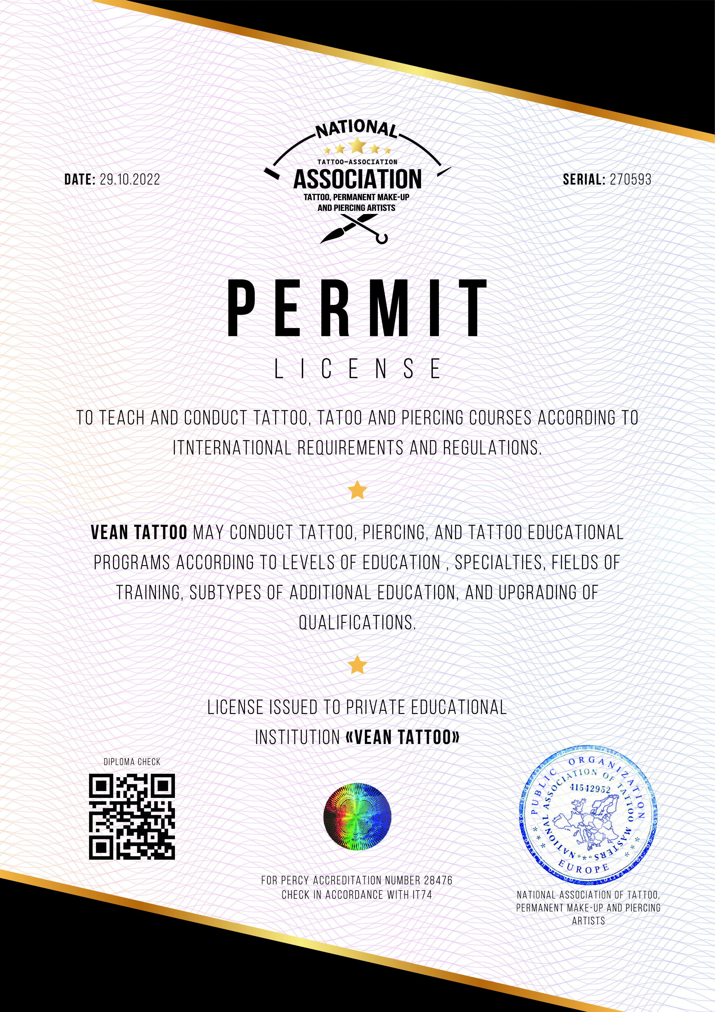 Being experts in tattoo, permanent make-up and piercing, NAM representatives are ready to answer any questions related to the verification of the artists diploma.