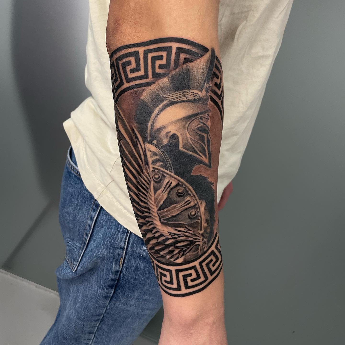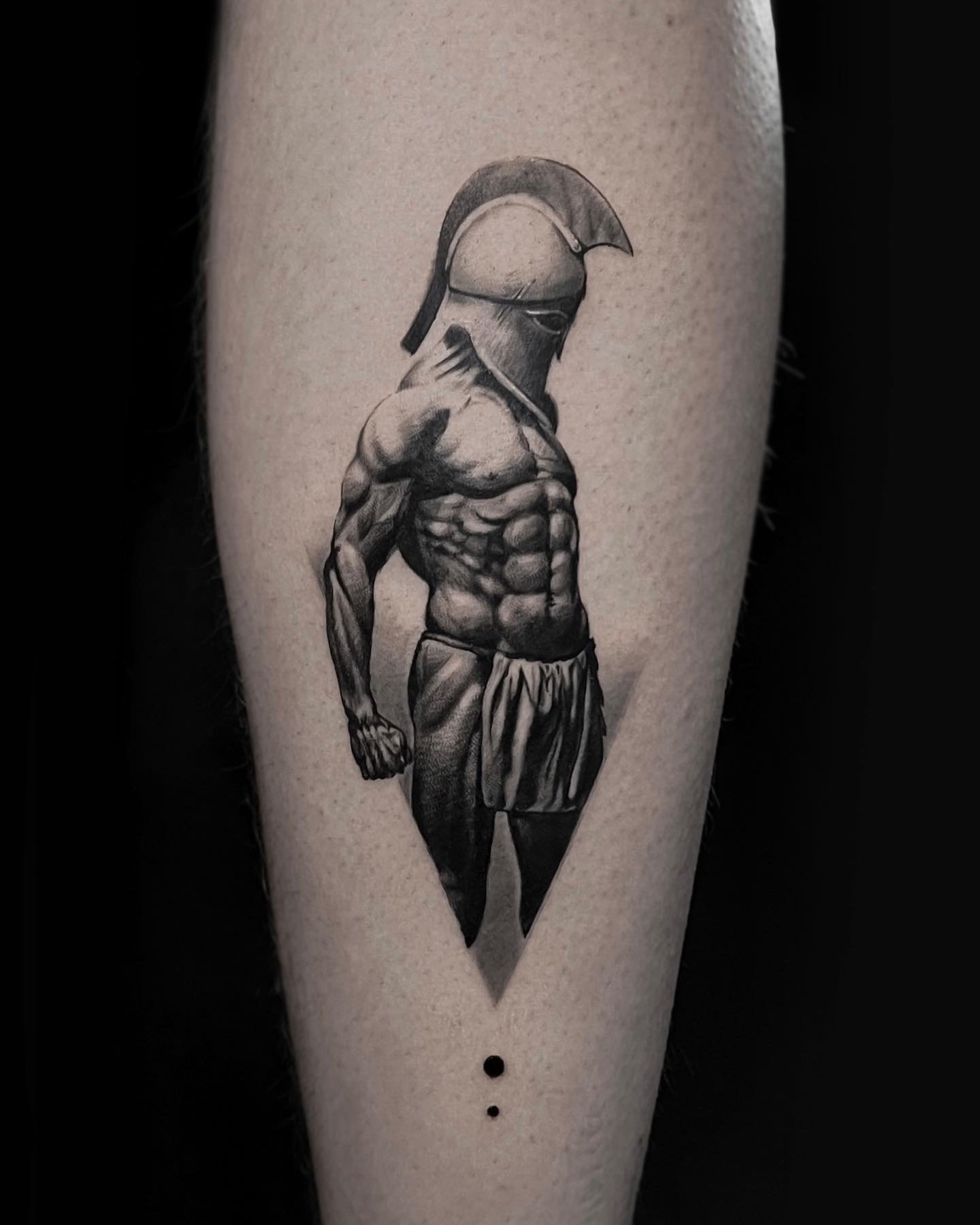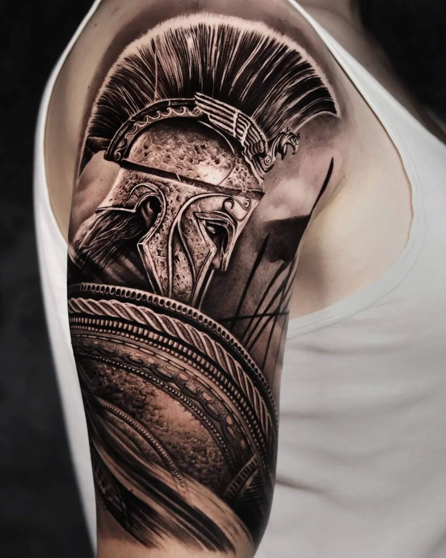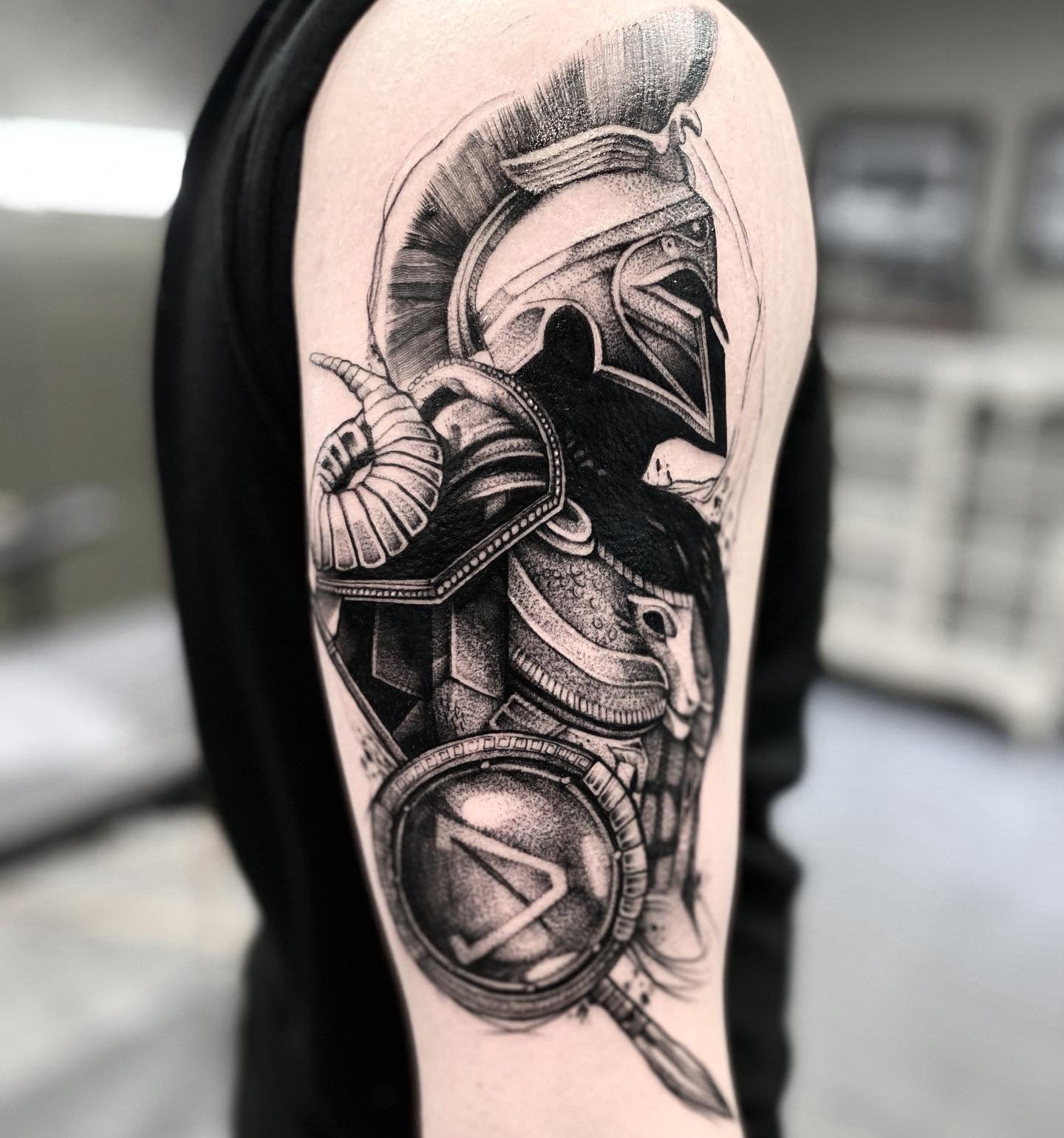 - This style uses black ink to create bold, contrasting images. Blackwork tattoos might include silhouettes of Spartans, helmets, or shields, all rendered in strict black-and-white tones.