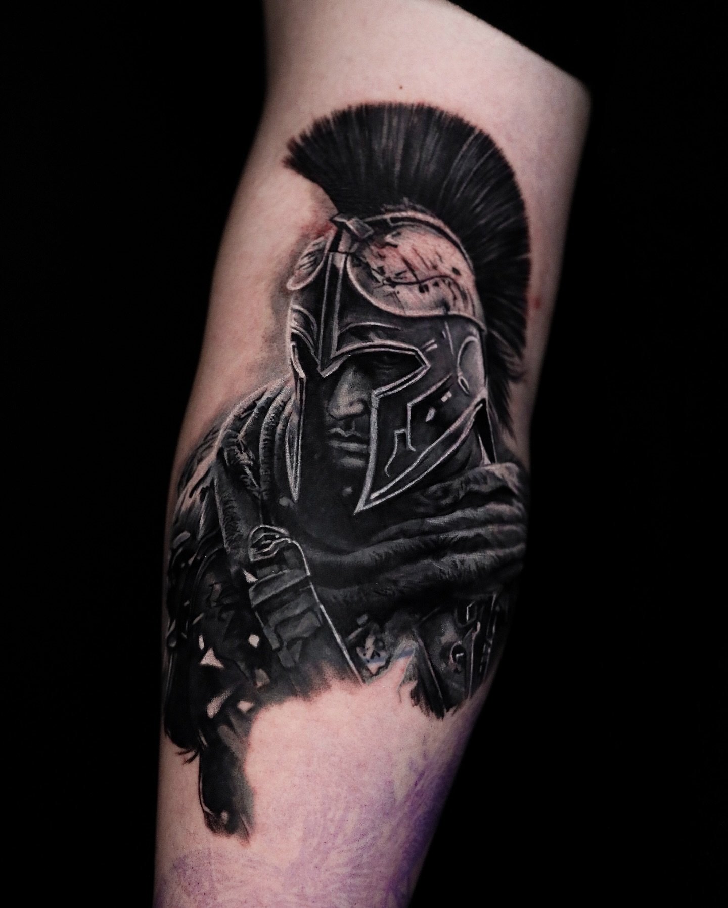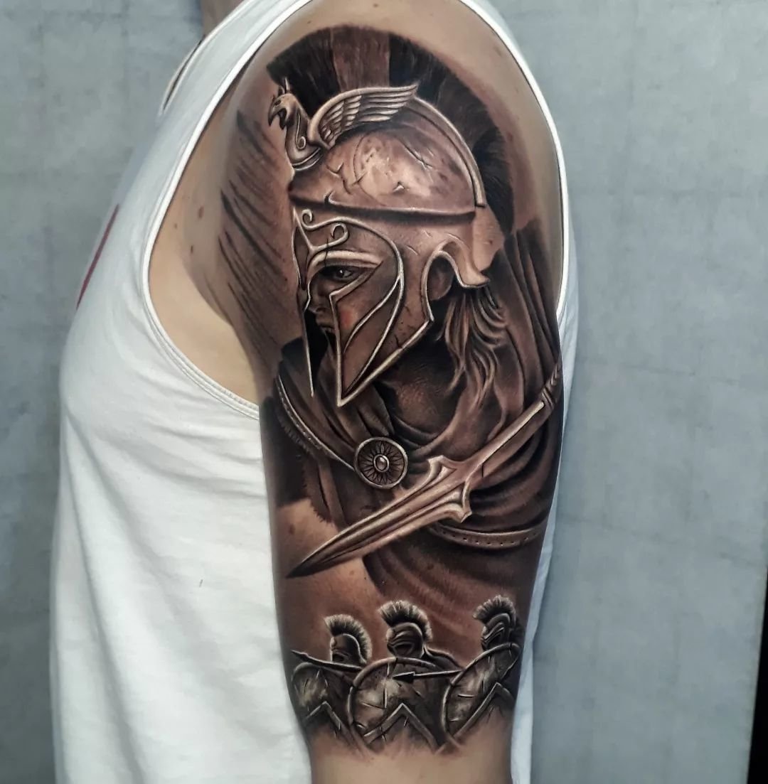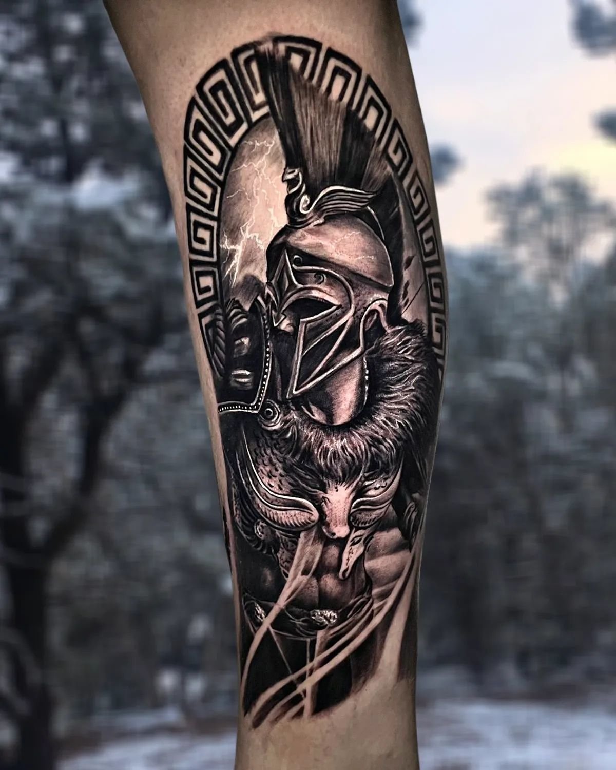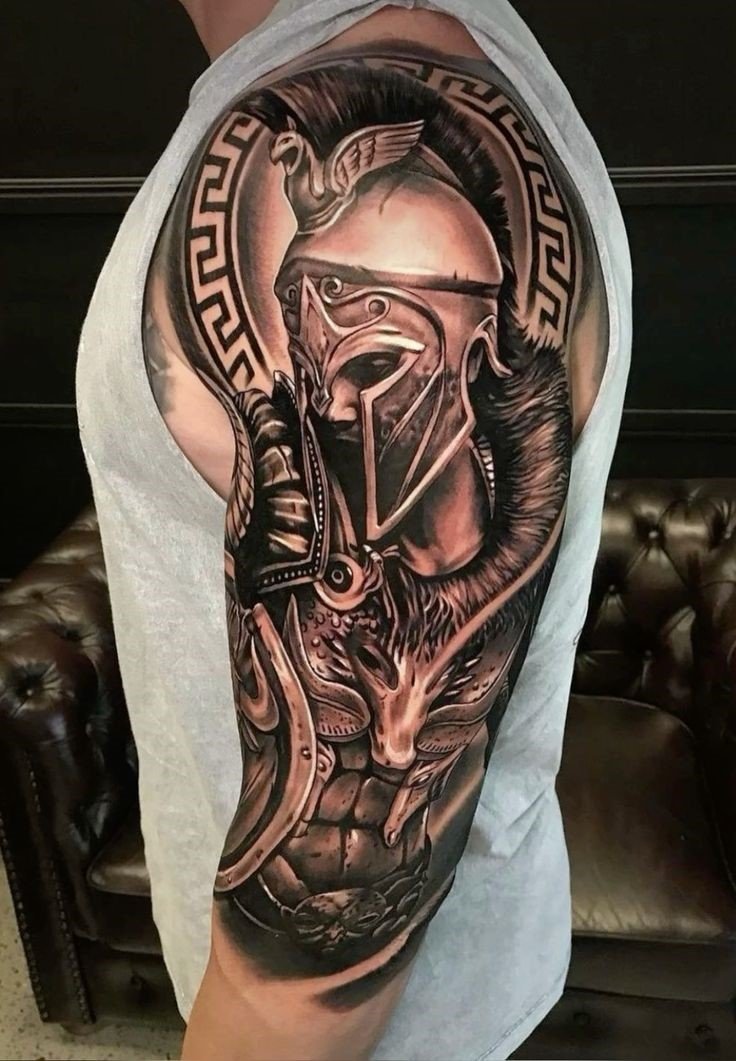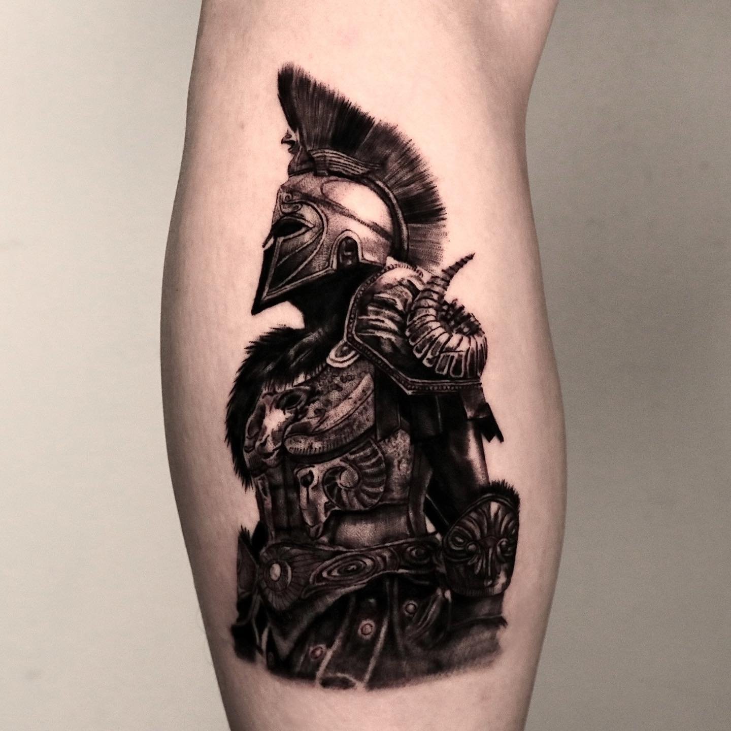 - This style uses black ink to create bold, contrasting images. Blackwork tattoos might include silhouettes of Spartans, helmets, or shields, all rendered in strict black-and-white tones.
