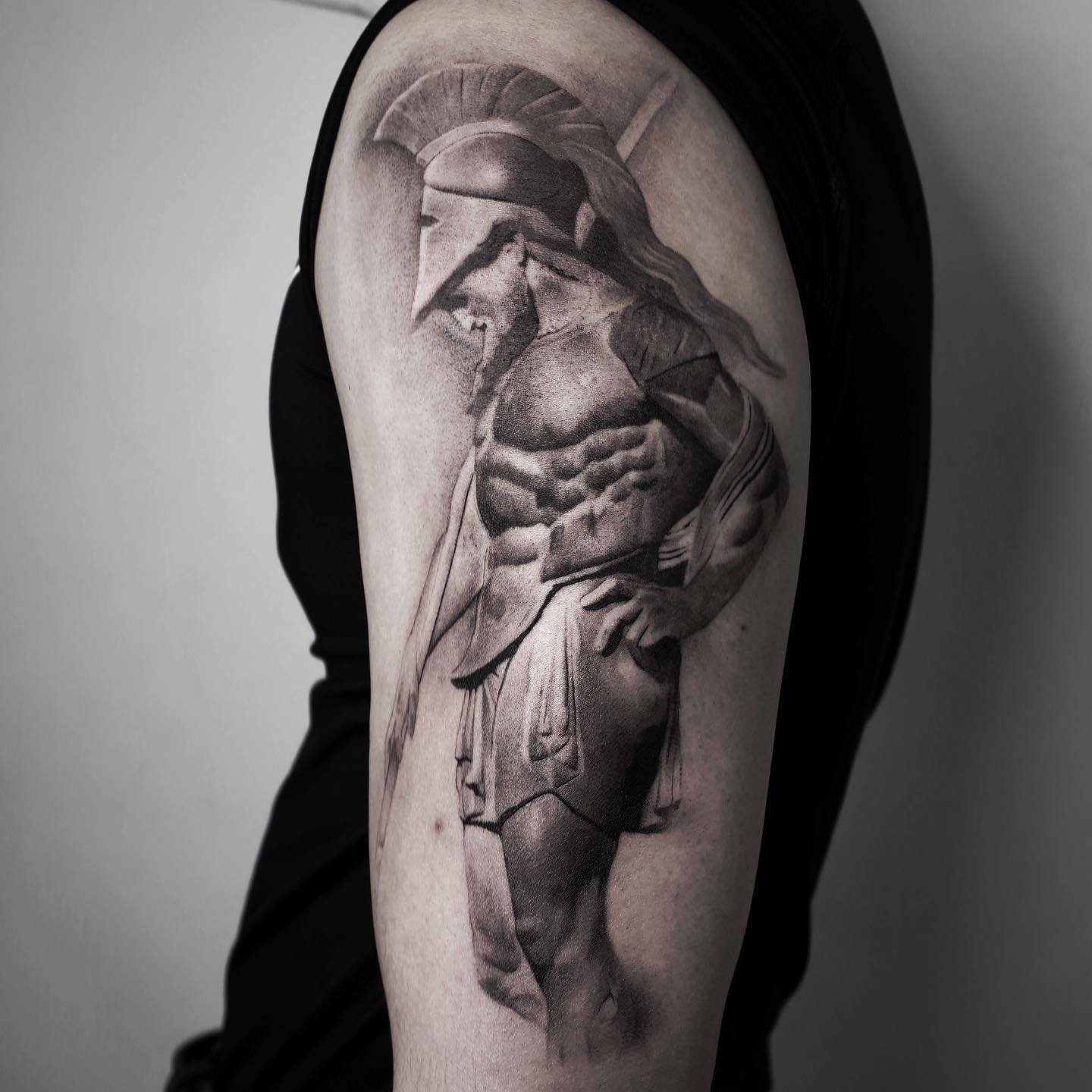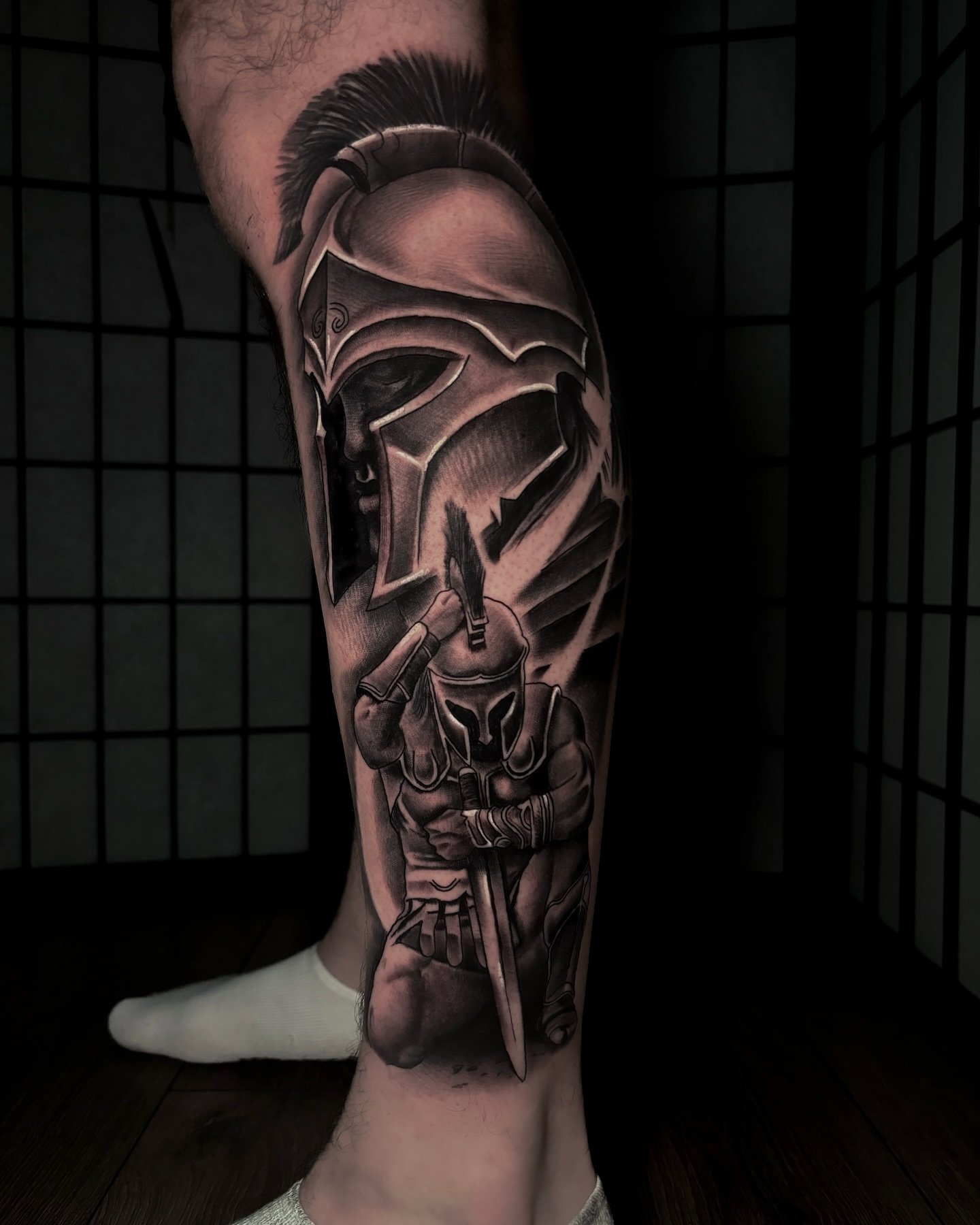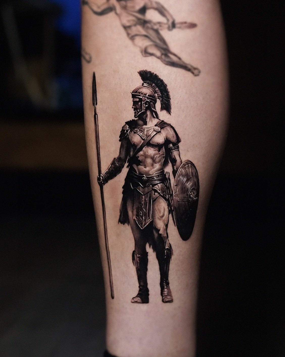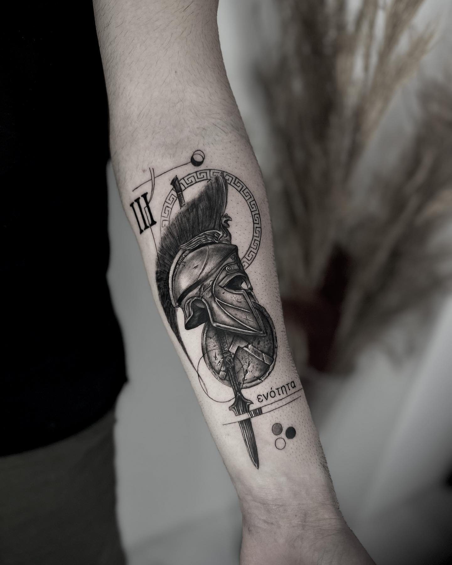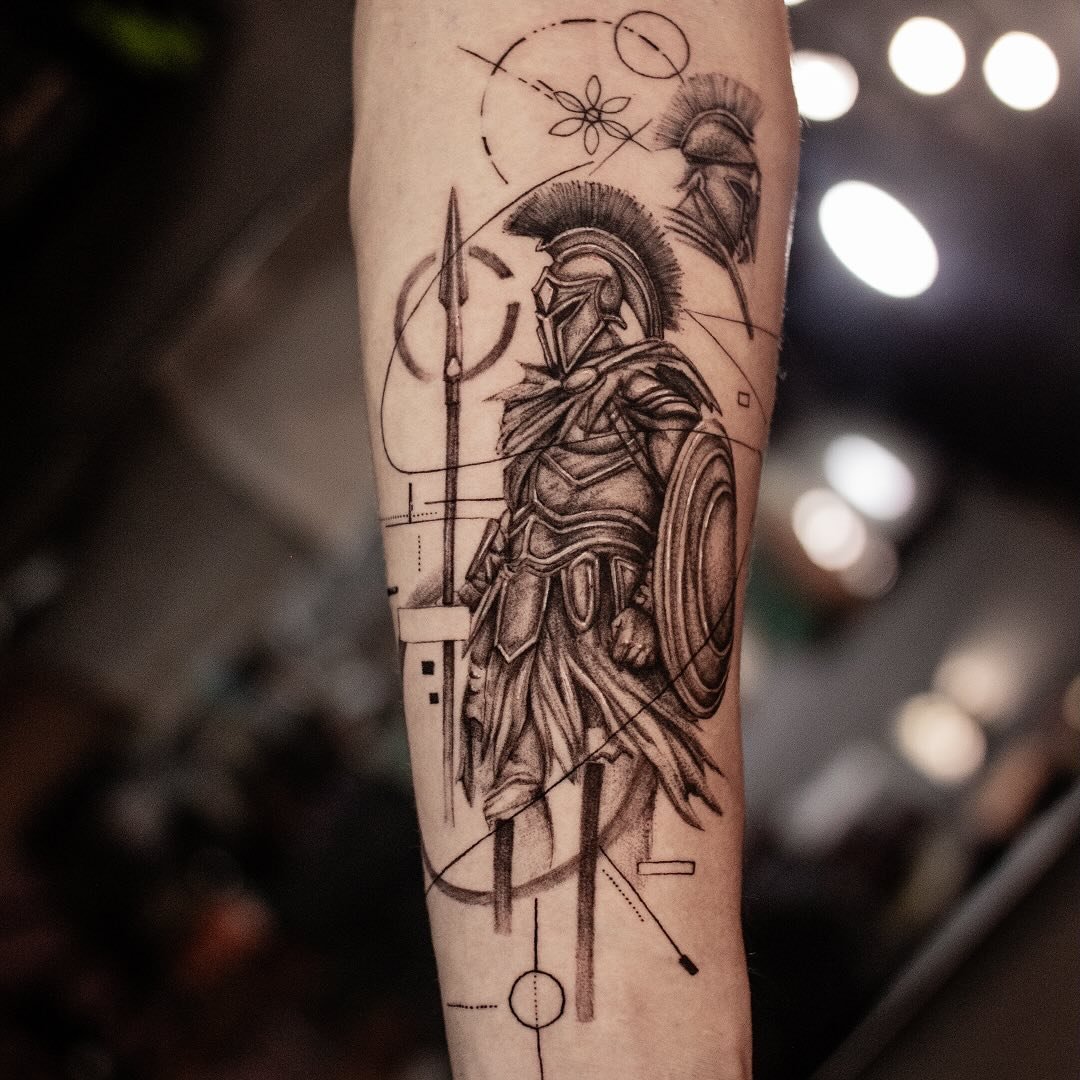 - This style uses black ink to create bold, contrasting images. Blackwork tattoos might include silhouettes of Spartans, helmets, or shields, all rendered in strict black-and-white tones.