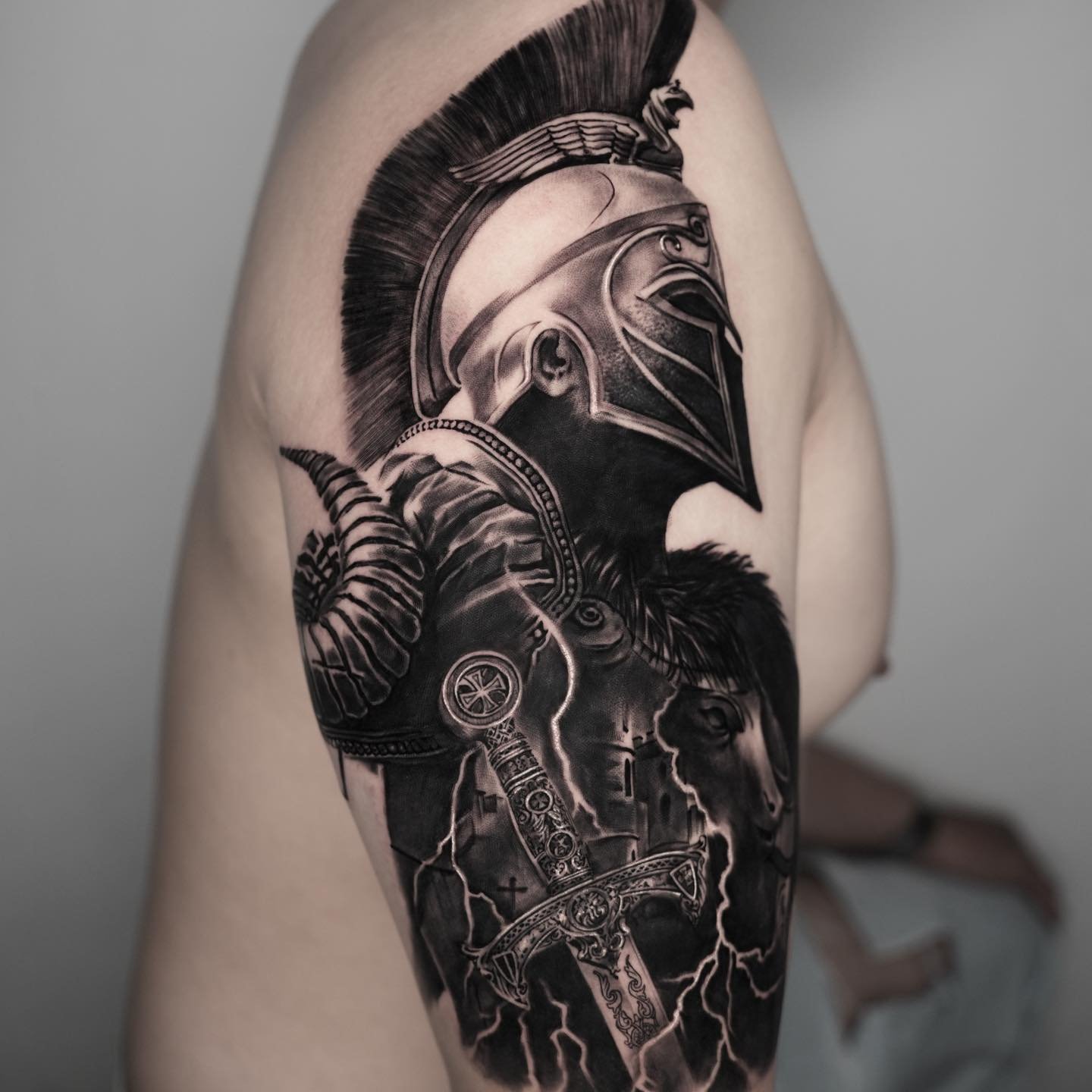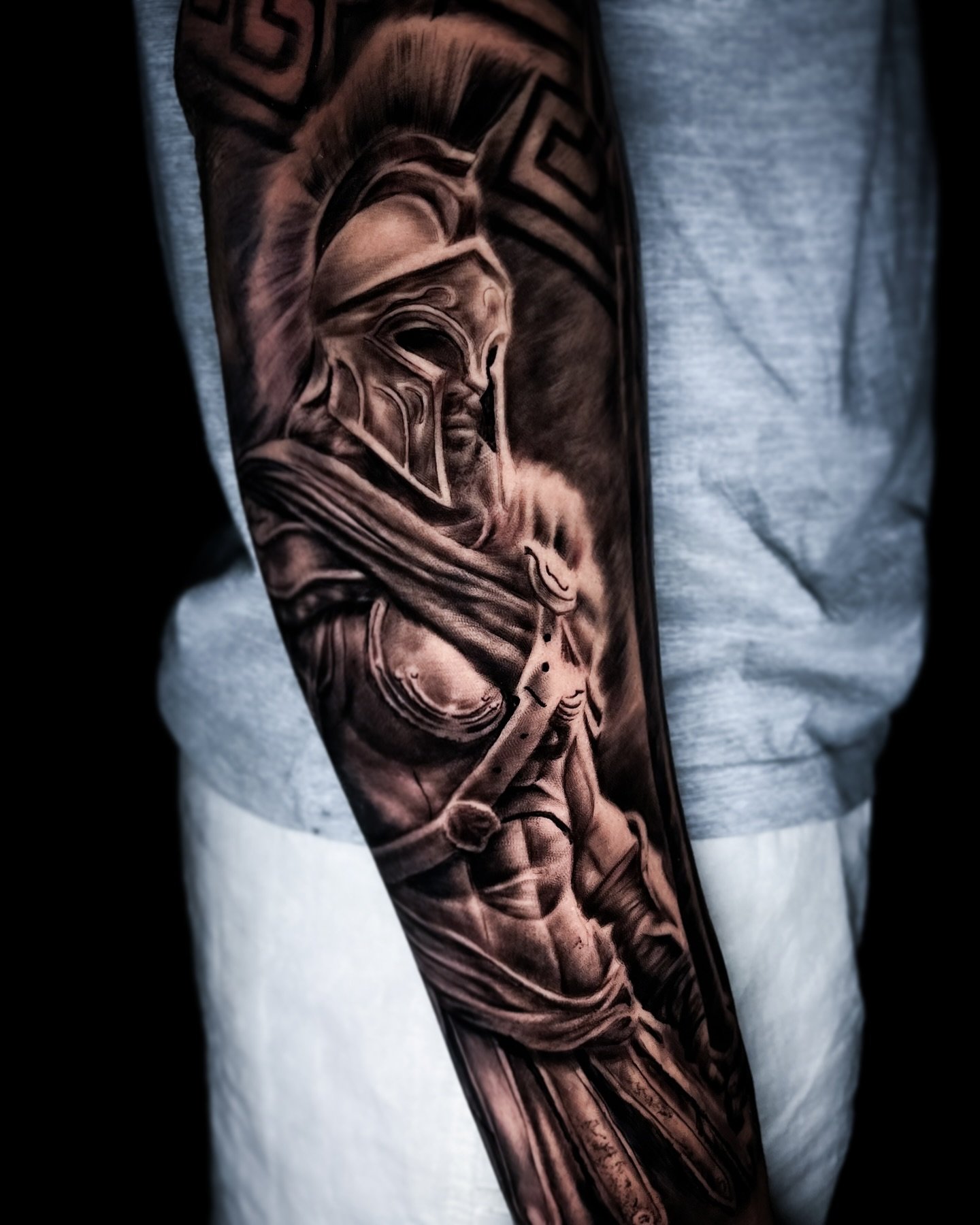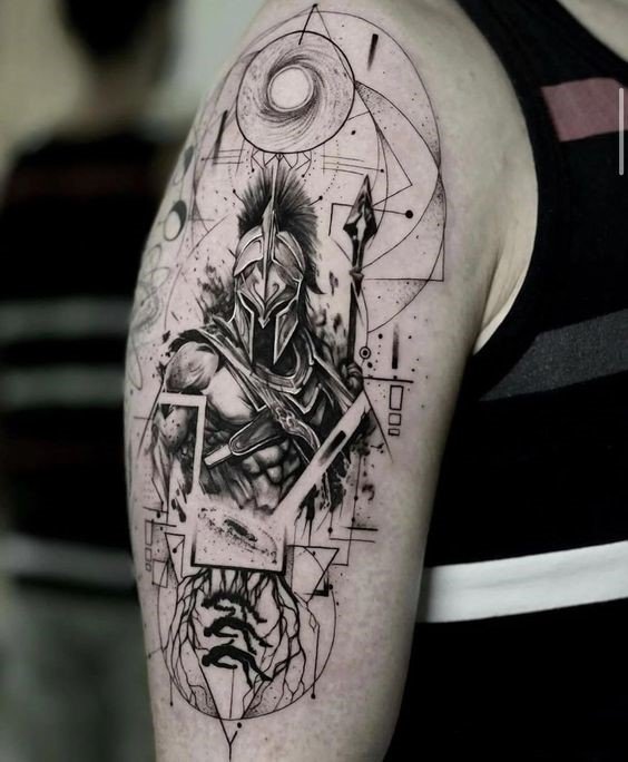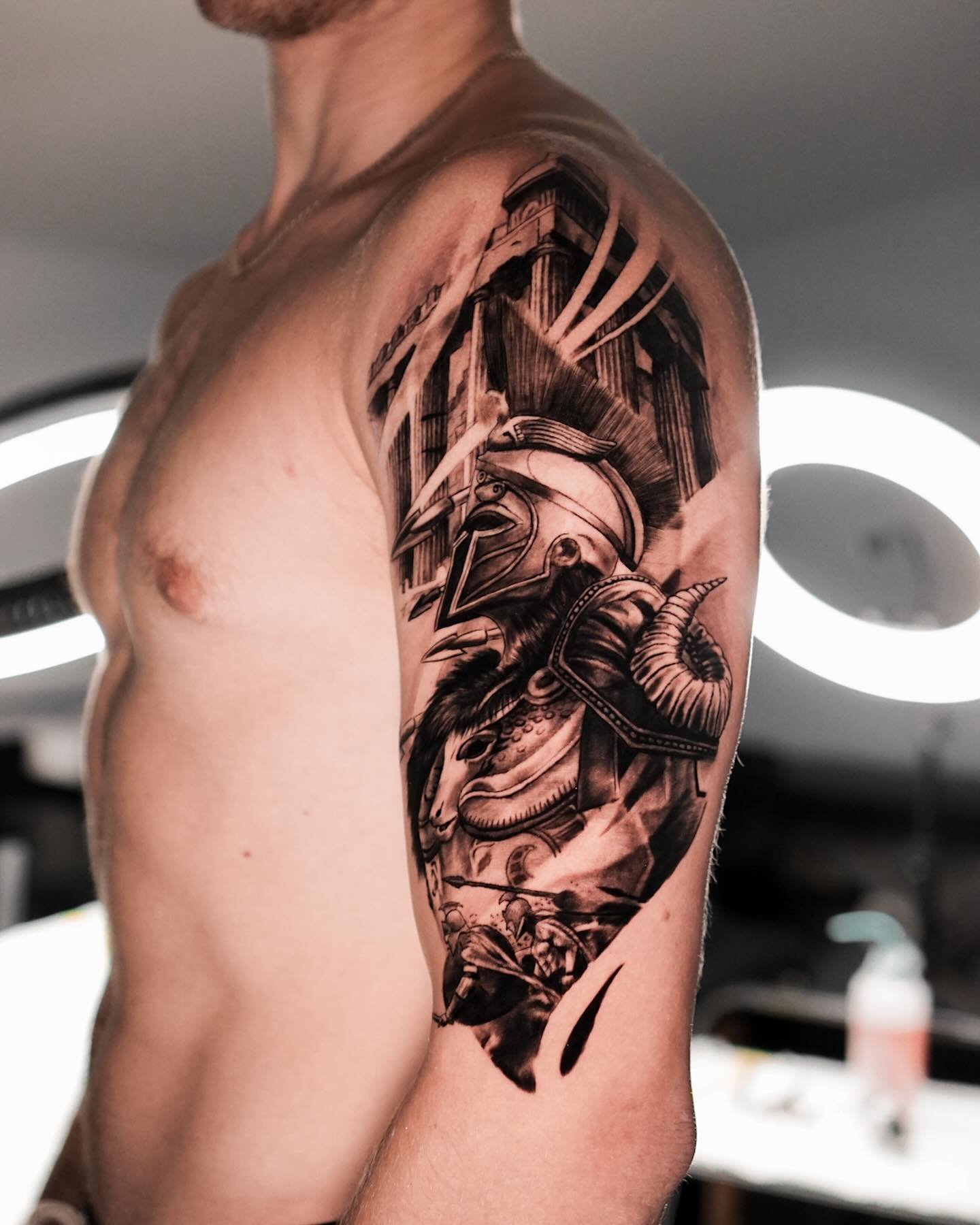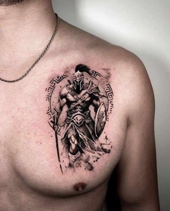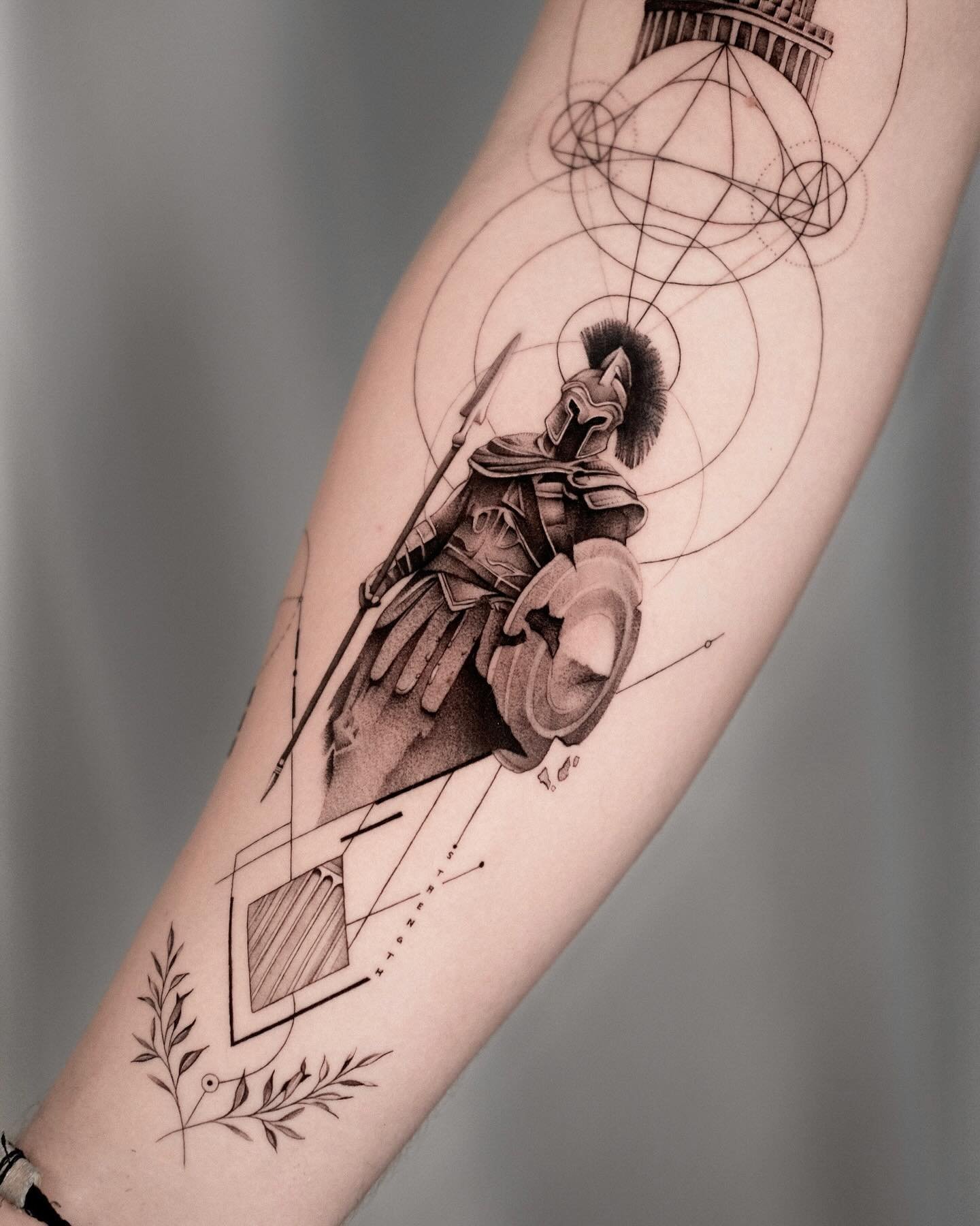 - This style uses black ink to create bold, contrasting images. Blackwork tattoos might include silhouettes of Spartans, helmets, or shields, all rendered in strict black-and-white tones.