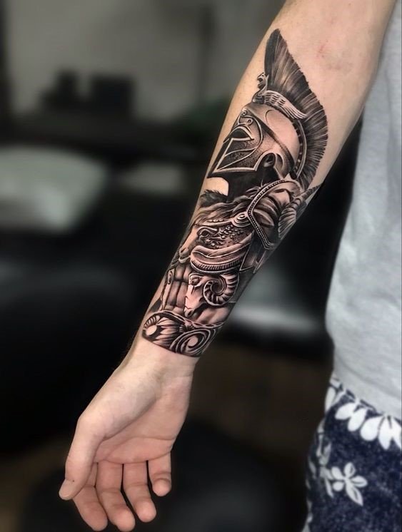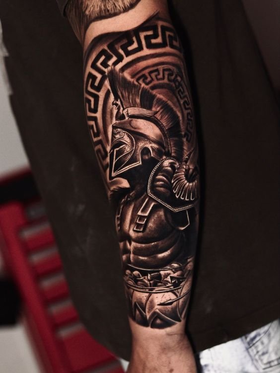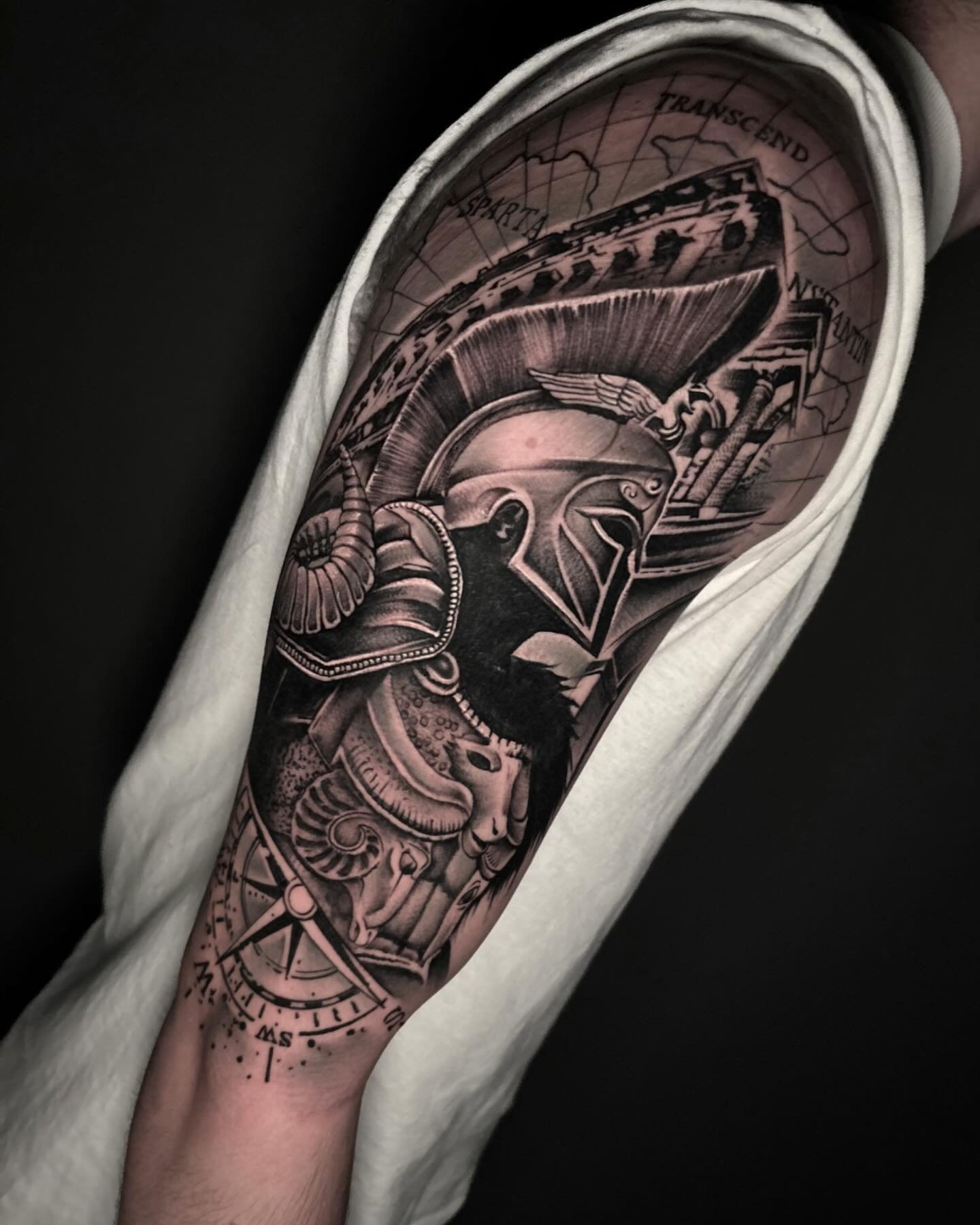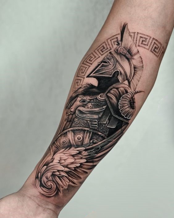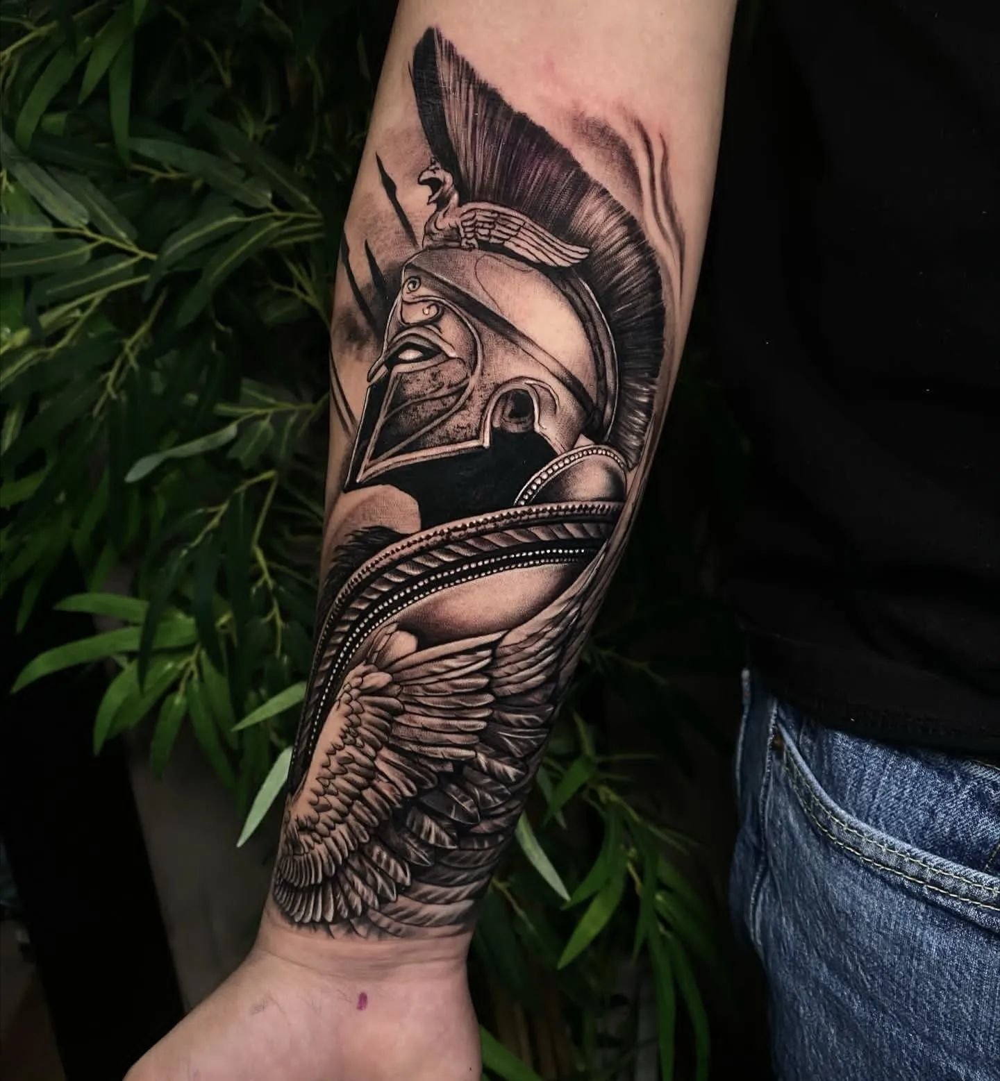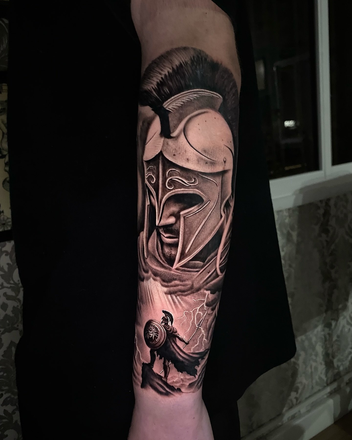 - This style uses black ink to create bold, contrasting images. Blackwork tattoos might include silhouettes of Spartans, helmets, or shields, all rendered in strict black-and-white tones.