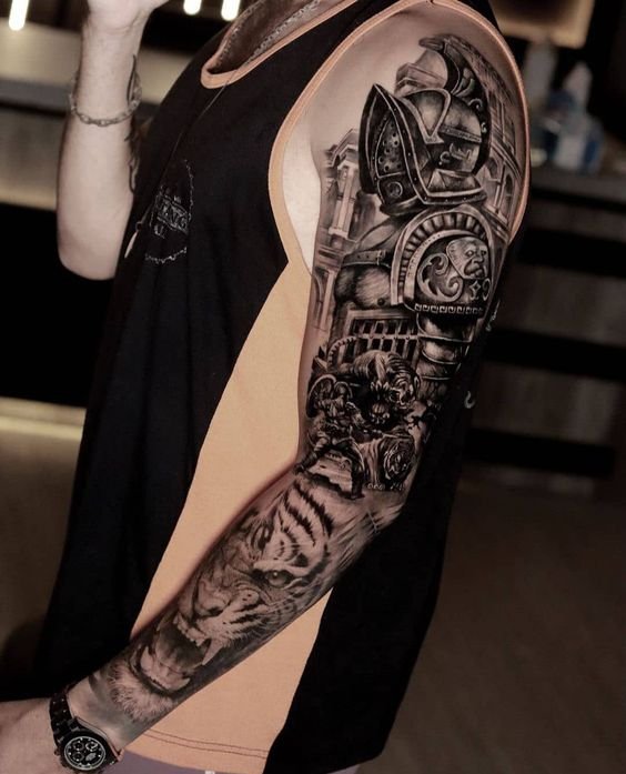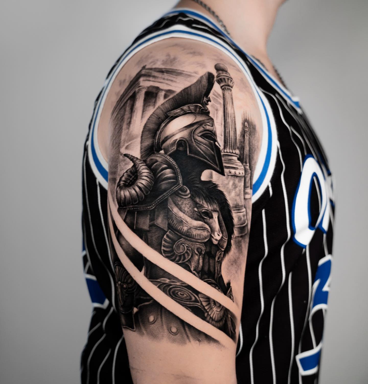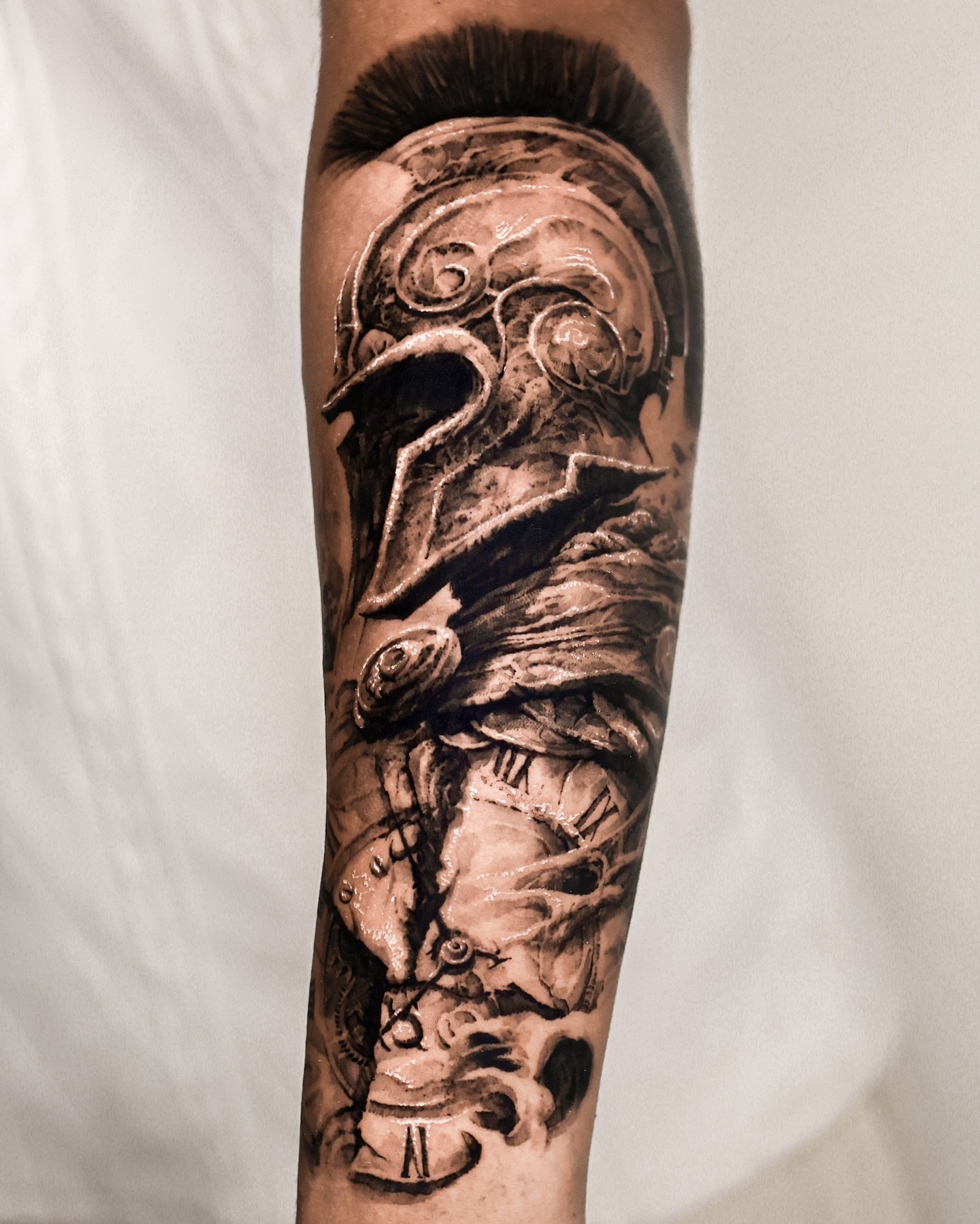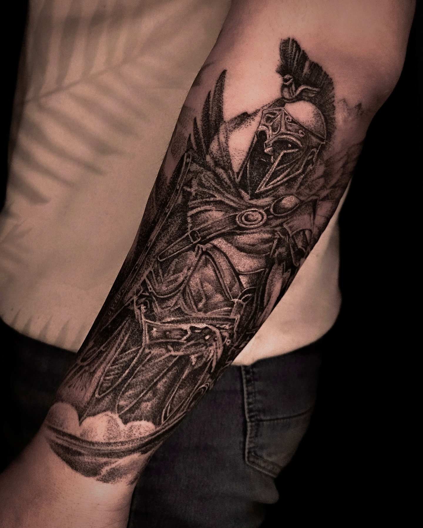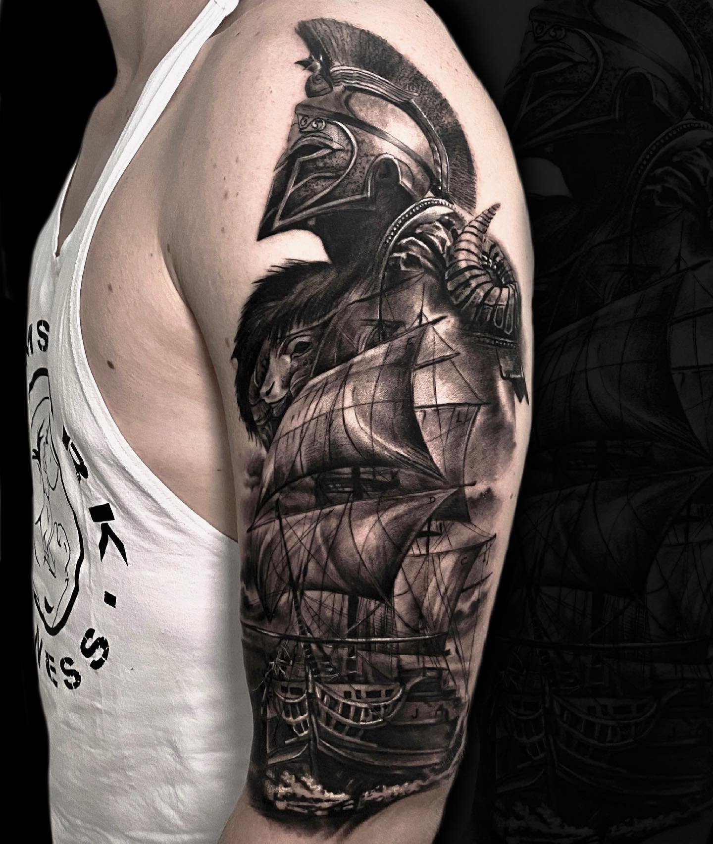 - This style uses black ink to create bold, contrasting images. Blackwork tattoos might include silhouettes of Spartans, helmets, or shields, all rendered in strict black-and-white tones.