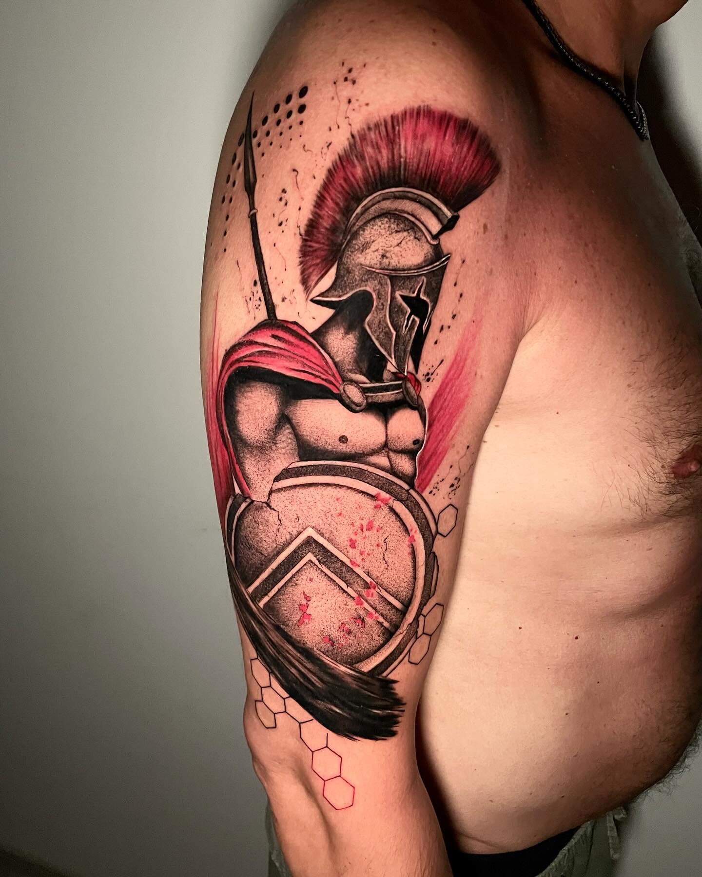 - Trash Polka tattoos are perfect for those looking to add a modern twist to their Spartan motifs. Combining realistic imagery with abstract elements and bright accents makes tattoos in this style truly unique.