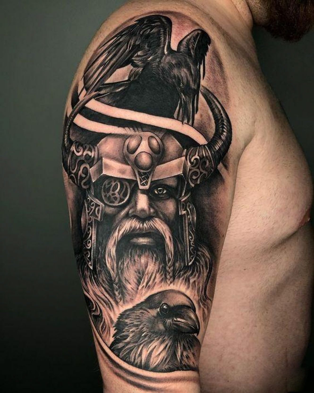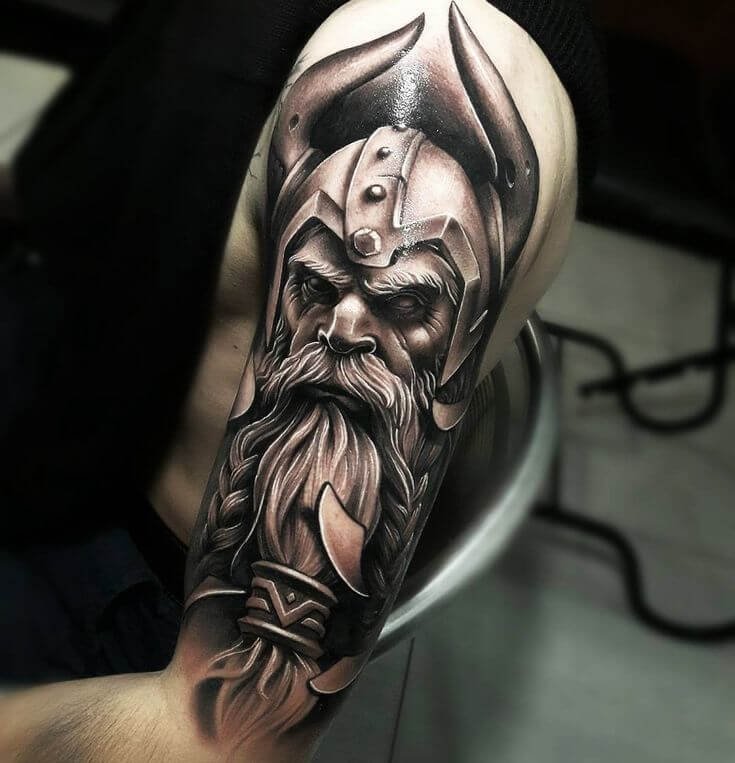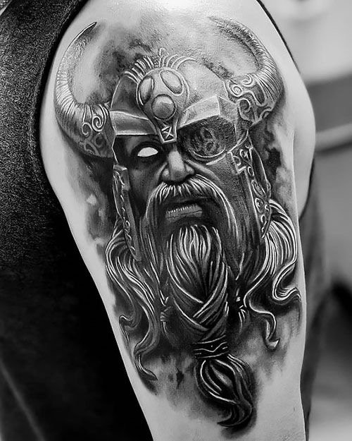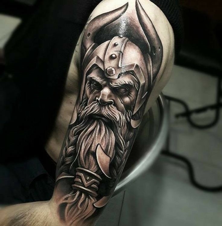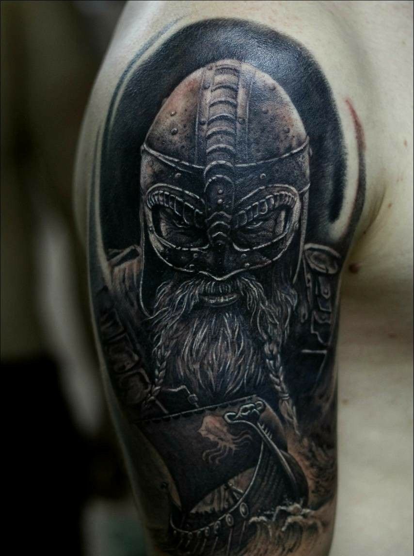 - The Viking with an axe or other weapon, wearing a helmet - emphasizes courage, strength, fearlessness. The most attractive it will look on the shoulder.