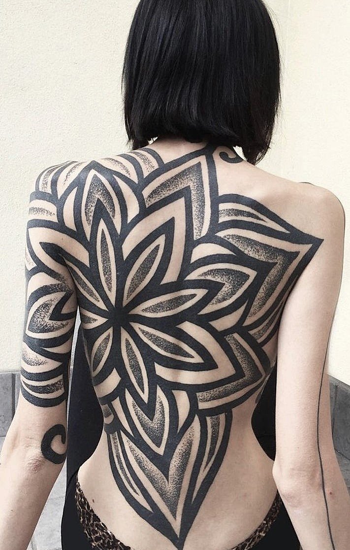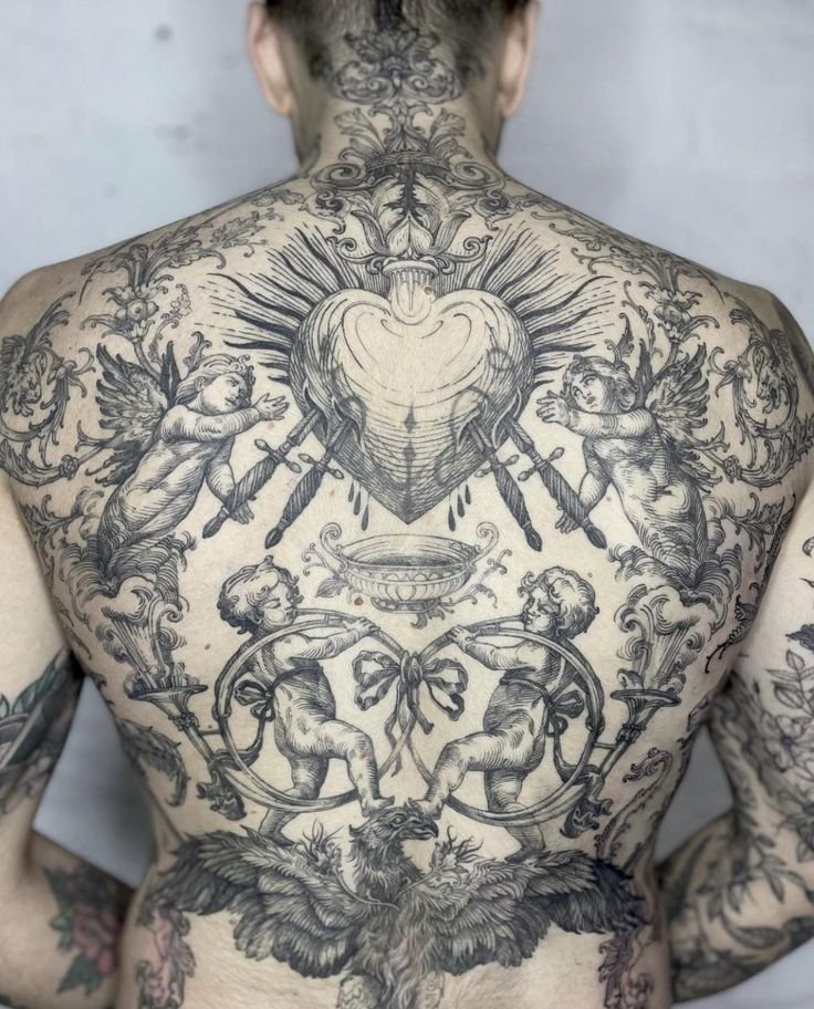 - Nugara ir krūtinė: didelės kompozicijos čia atrodo ypač įspūdingai.