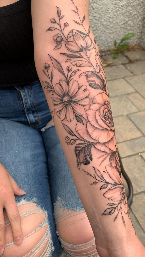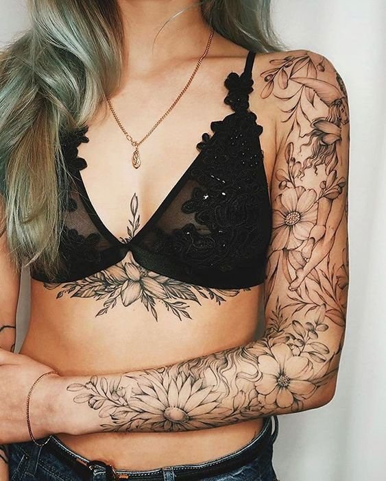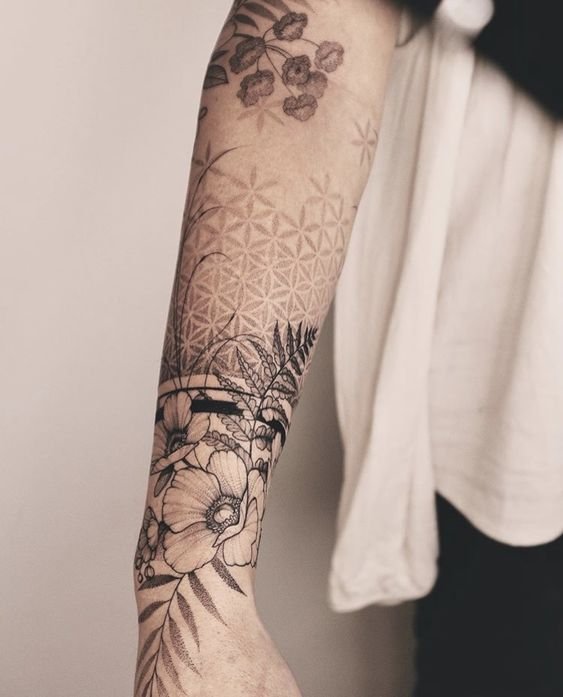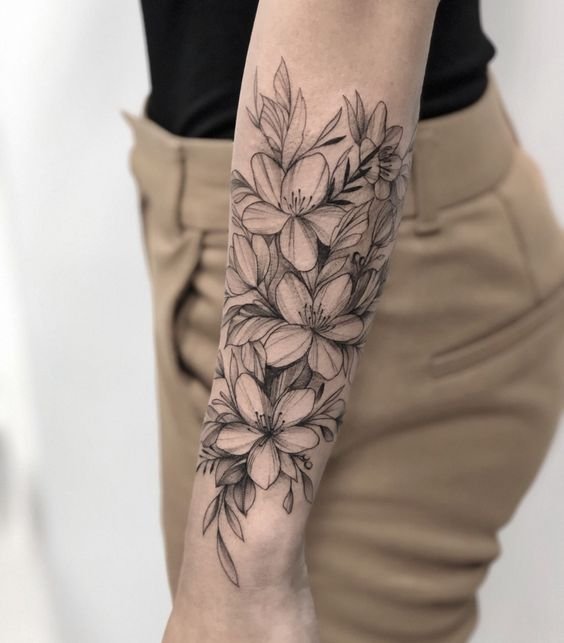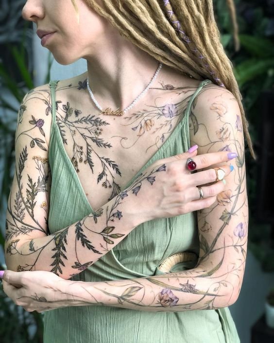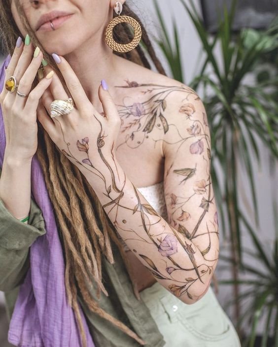 Ypač originalios spalvotos tatuiruotės. Įvairių augalų derinys tai ne tik graži kompozicija, jis turi gilią prasmę, kurią įtakoja kiekvienos gėlės simbolinė reikšmė.