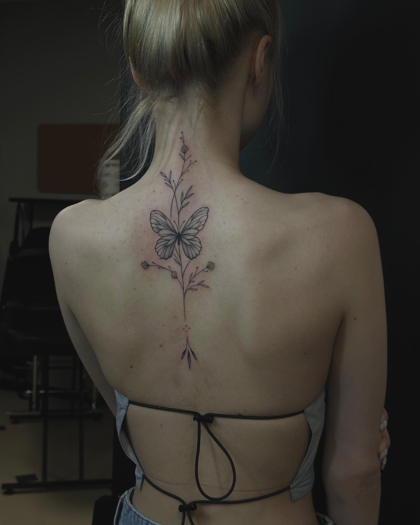 Moterų tatuiruotės ant nugaros dažnai išsiskiria grakštumu ir detaliu.
