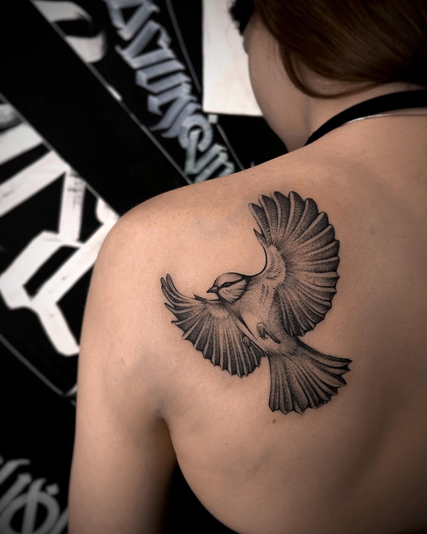 - Sparnai ir paukščiai: Sielos skrydis. Paukščių, tokių kaip kregždės, feniksai ar povai, atvaizdai dažnai pasirenkami tatuiruotėms ant nugaros. Jie simbolizuoja laisvę, atgimimą ir grožį. Gyvūnai, tokie kaip vilkai ar lapės, taip pat yra populiarūs tarp moterų.