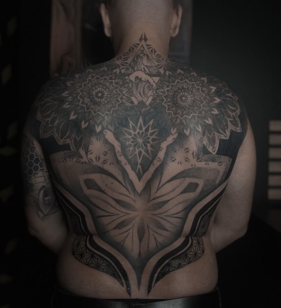 - Mandalos: Harmonijos ir pusiausvyros simboliai. Simetriški ir detalizuoti mandalų raštai simbolizuoja harmoniją ir vidinę pusiausvyrą. Tokios tatuiruotės dažnai pasirenkamos viršutinės nugaros dalies ar centro papuošimui.