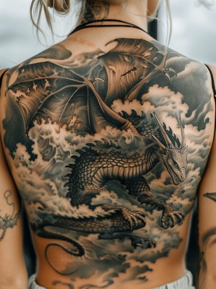Populiarios vietos moteriškoms drakono tatuiruotėms apima šoną, nugarą ir aplink klubus, leidžiančios sukurti didelius ir efektingus darbus.