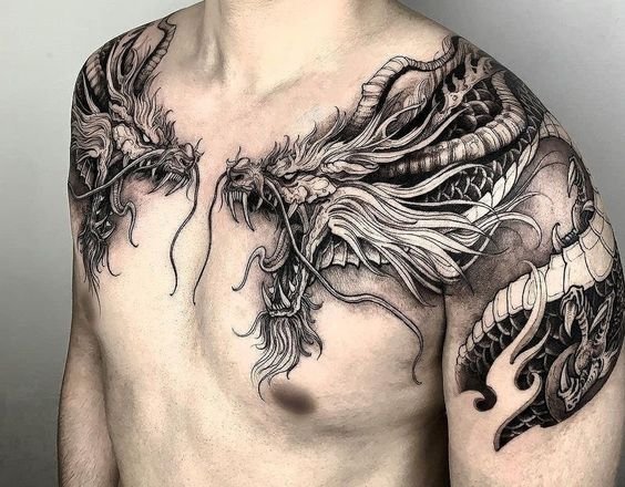 - Krūtinė ir pečiai: Drakonas, apsivijęs aplink pečius, gali simbolizuoti nešėjo pasirengimą prisiimti sunkumus ir apsaugoti artimuosius.