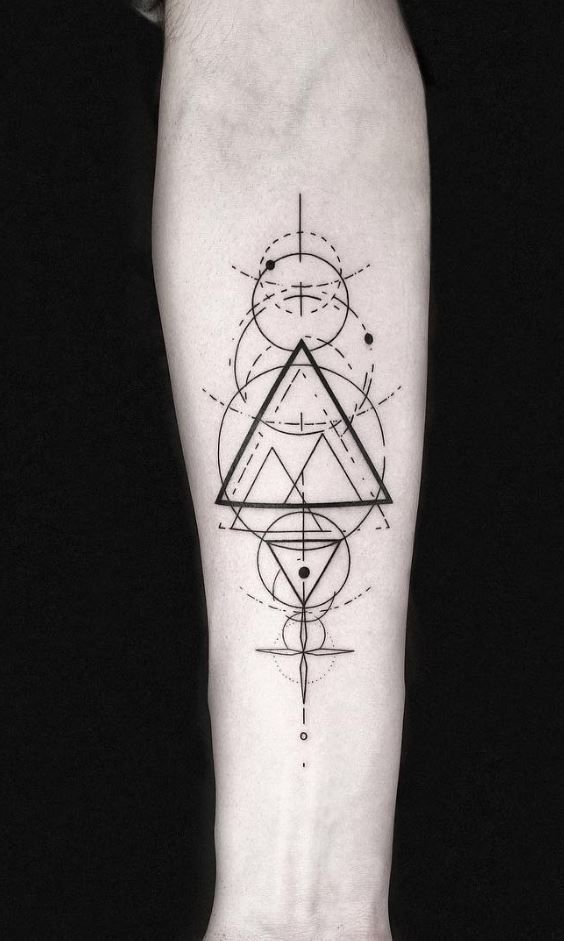 Verta paminėti, kad daugelio slaptųjų draugijų simbolikoje yra geometrinių figūrų, todėl daugeliui žmonių geometriniai vaizdai asocijuojasi su kažkuo paslaptingu, šventu. Būtent dėl ne visiems žinomos prasmės, kuri yra „paslėpta“ nuo kitų, daugelį ir pritraukia geometriniai vaizdai. Be to, tokie darbai visada labai patrauklūs, nepaprasti ir labai originalūs. Dažnai tatuiruotėse yra trikampis, kuris simbolizuoja šeimos, saugumo ir gyvenimo pusiausvyrą, taip pat liepsną, ugnį ir matematinį skaičių - 3.