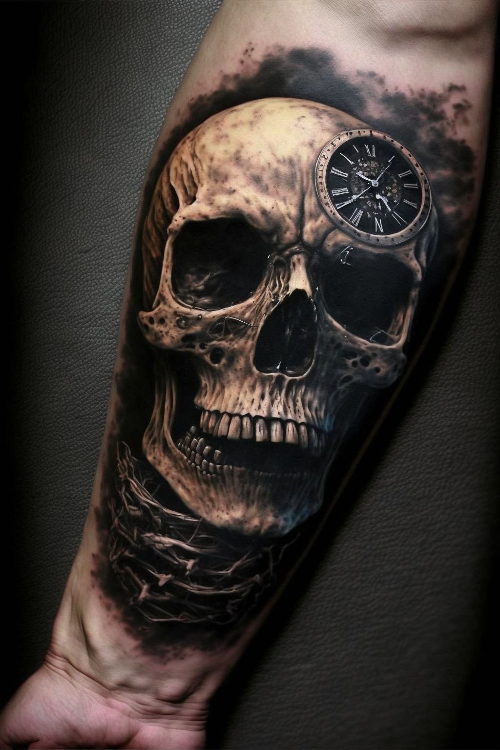 - Kaukolės tatuiruotės eskizas laikrodžio fone tiesiogiai teigia apie žmogaus gyvenimo greitą bėgį. Pasirinkę šį variantą vyrai ir moterys primena sau – visa neamžina, būtina veikti čia ir dabar.