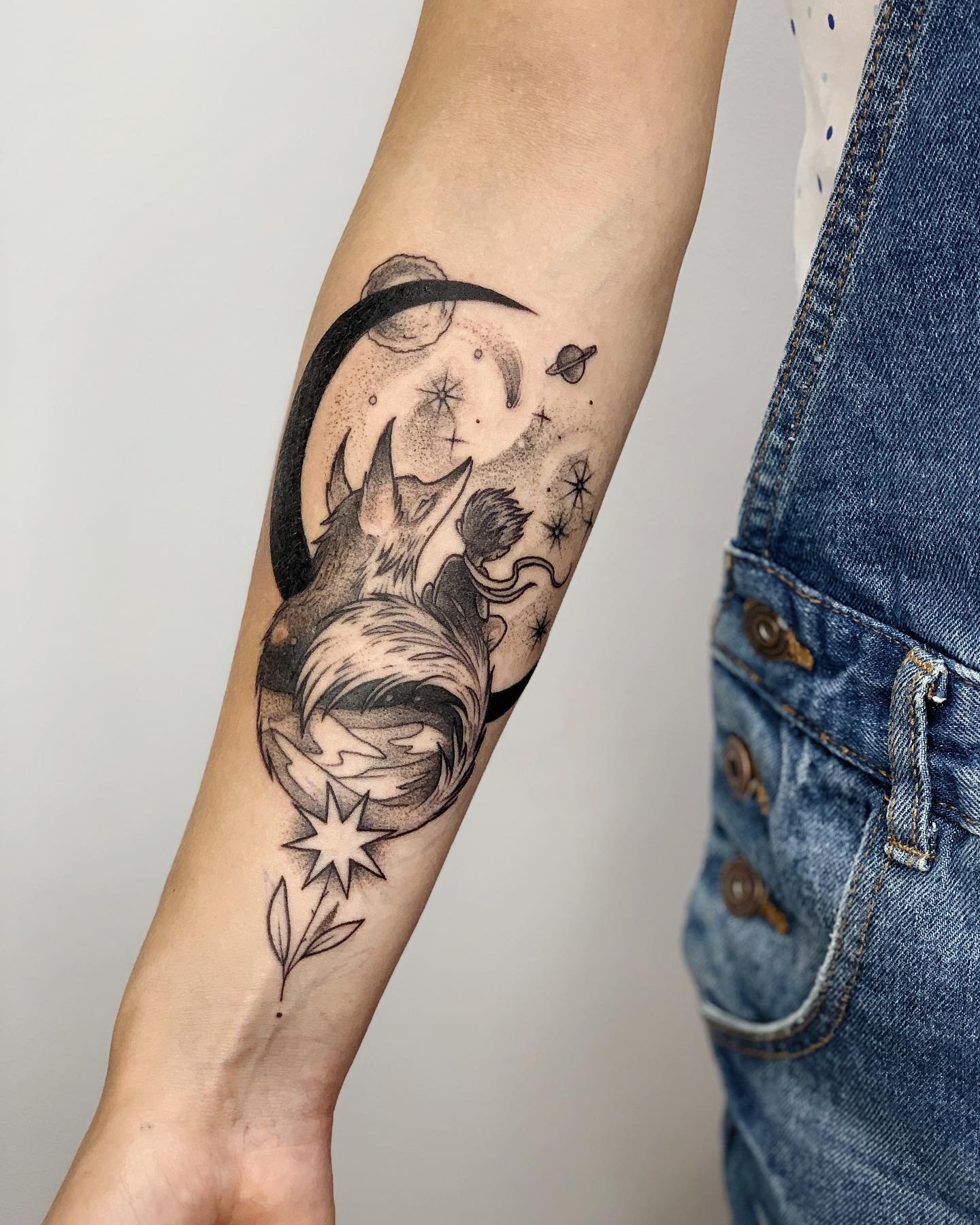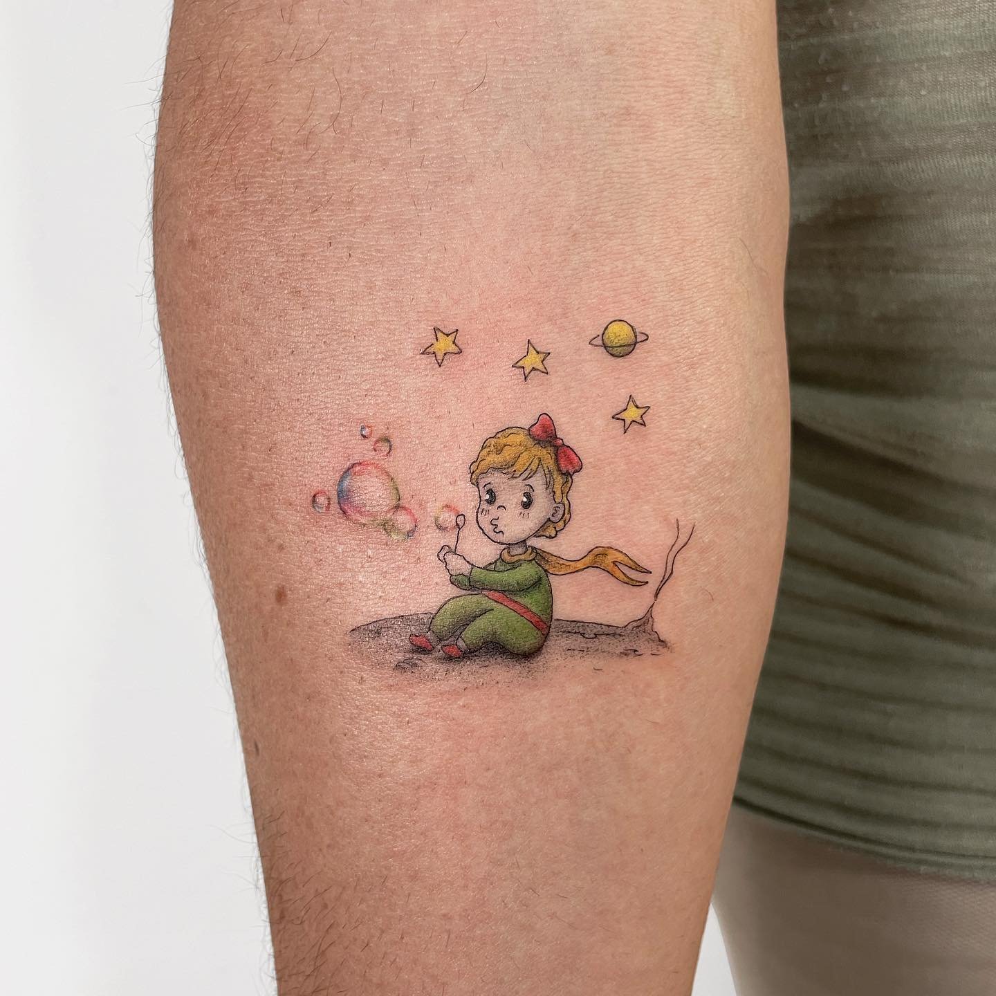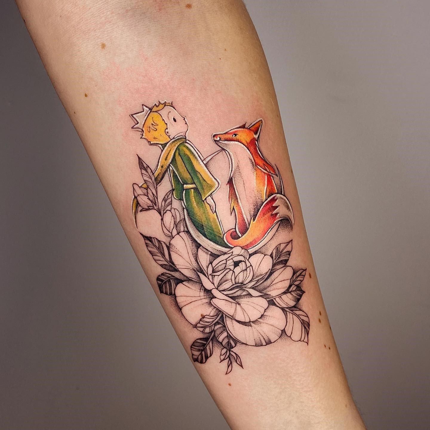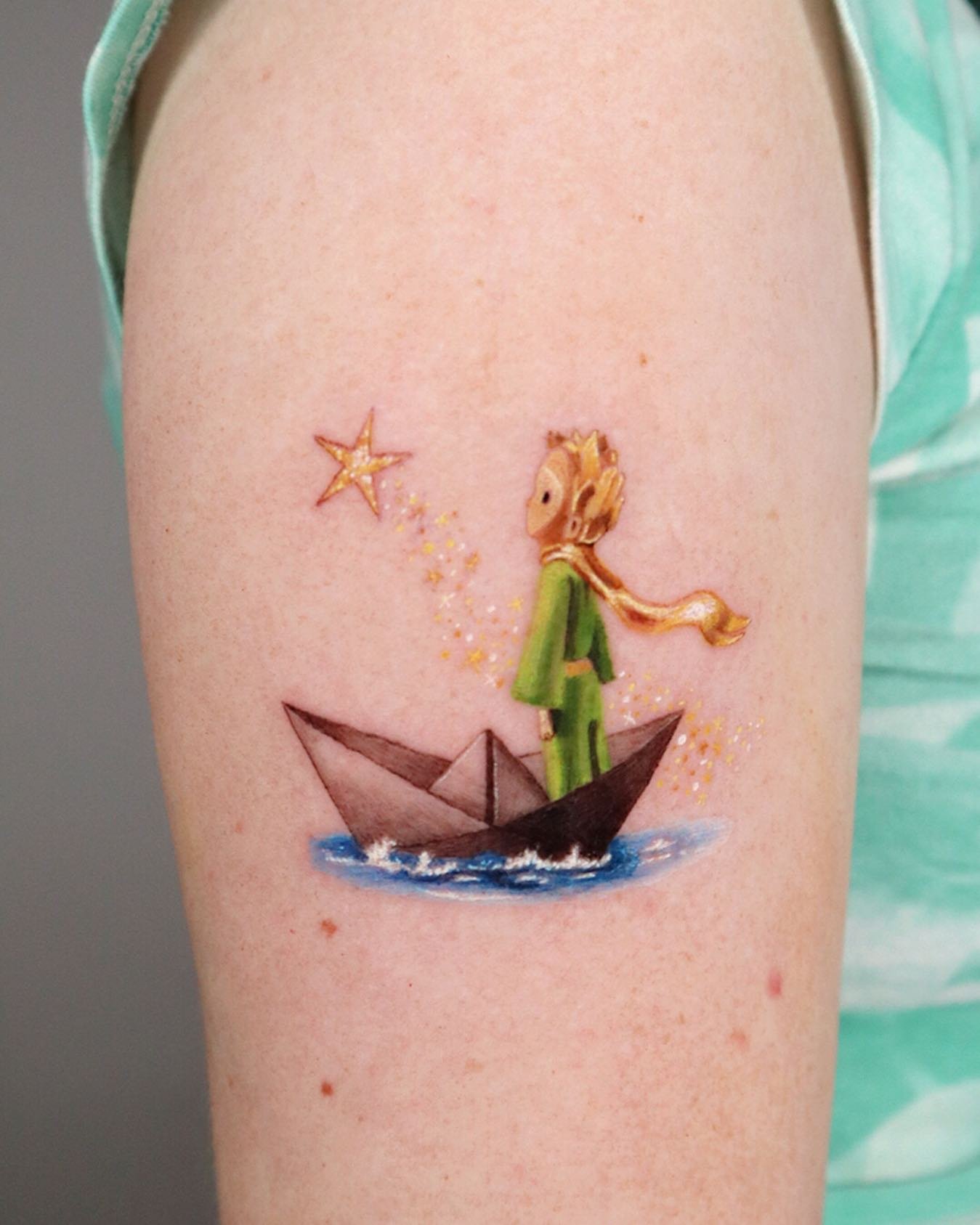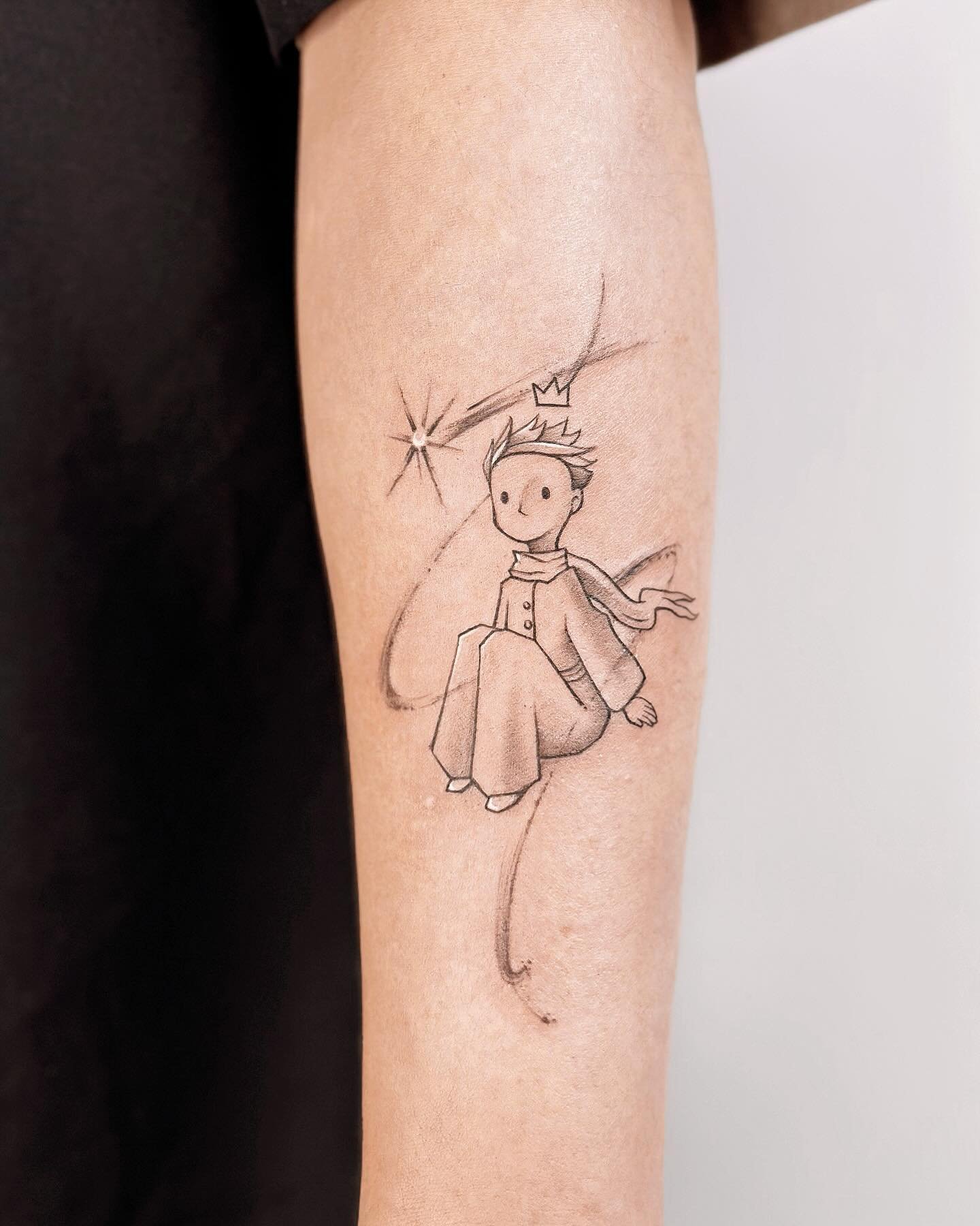 - Realistinio stiliaus Mažasis princas gali atrodyti brandesnis ir detalesnis, kas suteikia atvaizdui rimtumo ir svarbos. Tokios tatuiruotės atliekamos su didele detalizacija, leidžiančia perteikti kiekvieną herojaus išvaizdos niuansą.