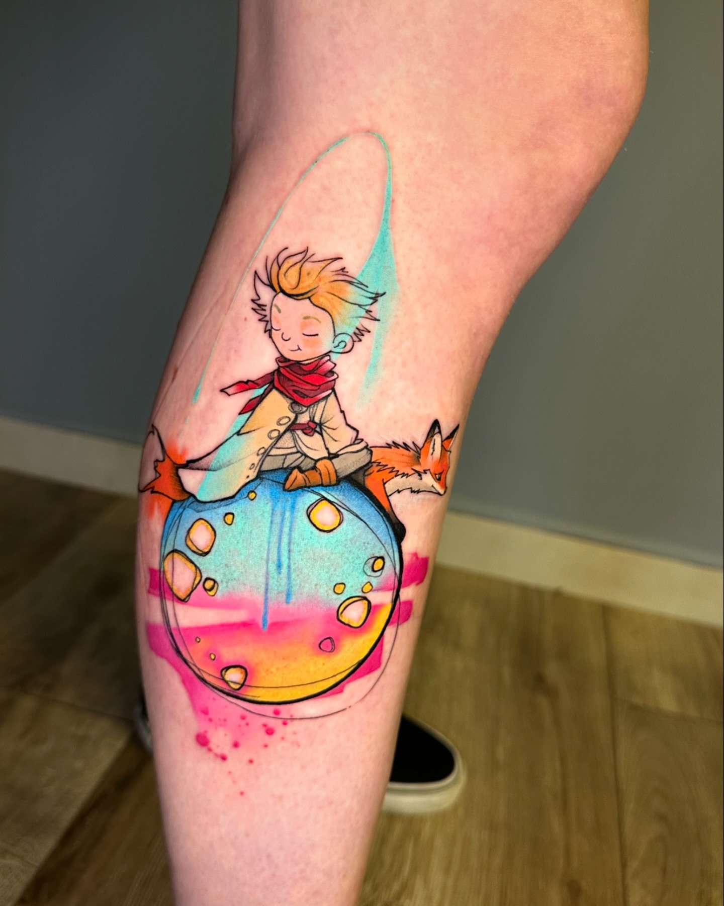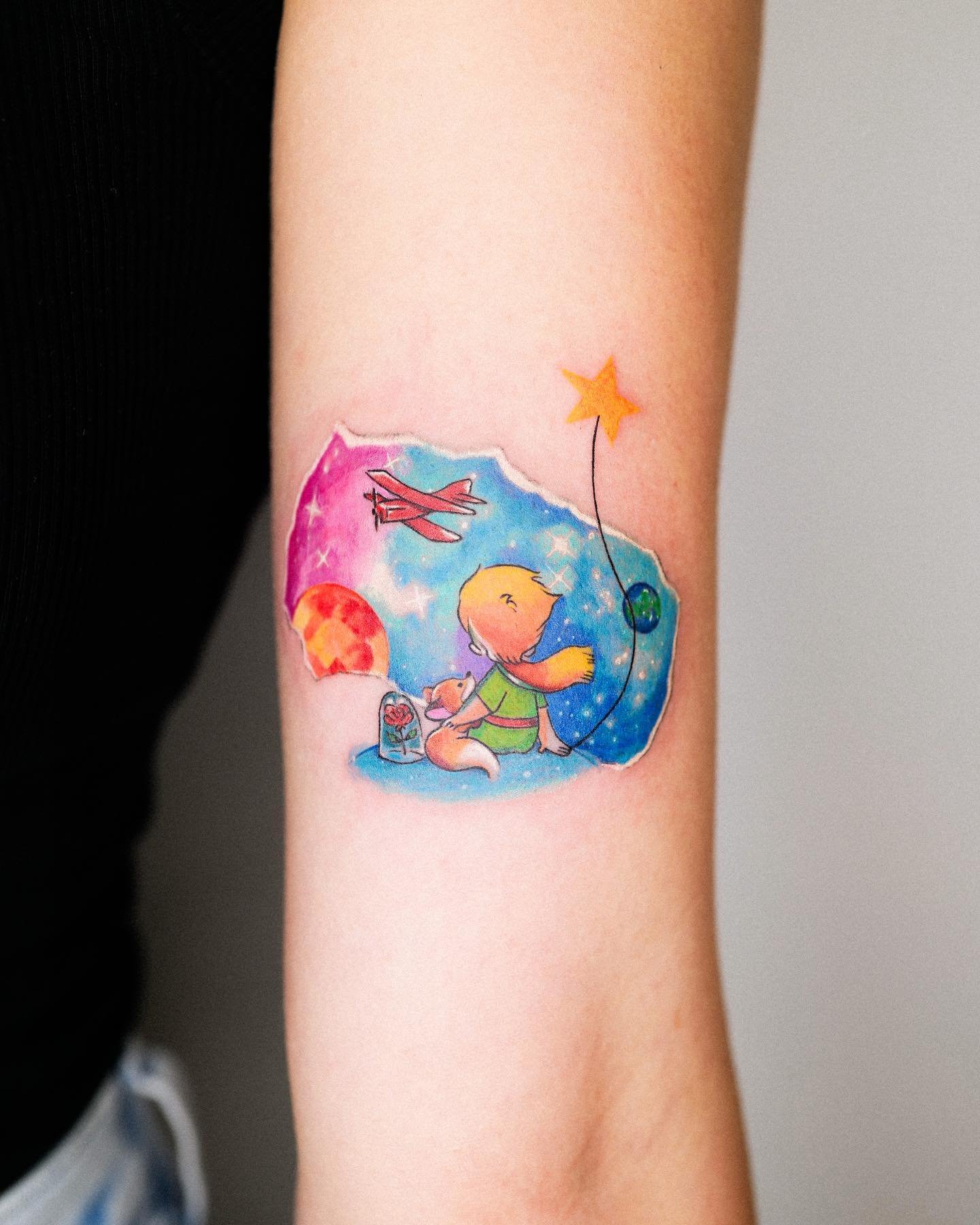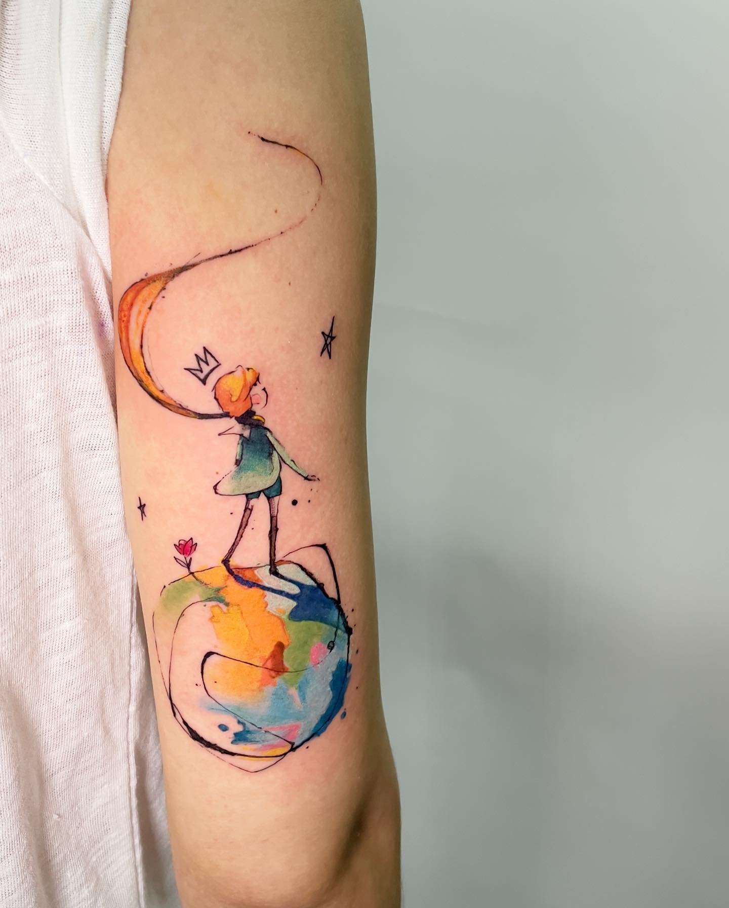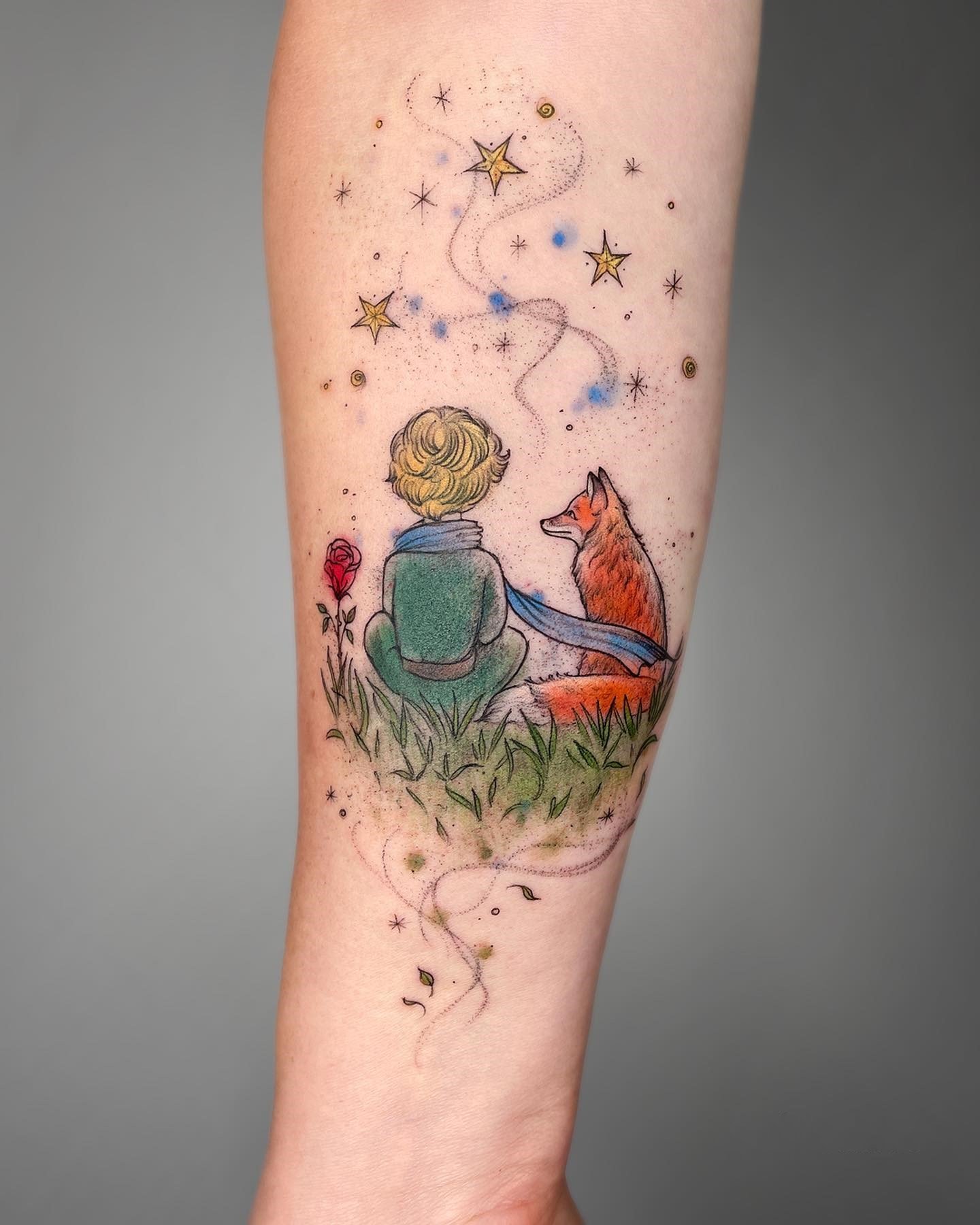 - Akvarelės stiliaus tatuiruotės su Mažojo princo atvaizdu pasižymi švelniais, išplautais perėjimais ir subtiliais spalvų gradientais, kurie padaro vaizdą dar magiškesnį. Šis stilius pabrėžia herojaus lengvumą ir svajingumą, jo ryšį su fantazijomis.