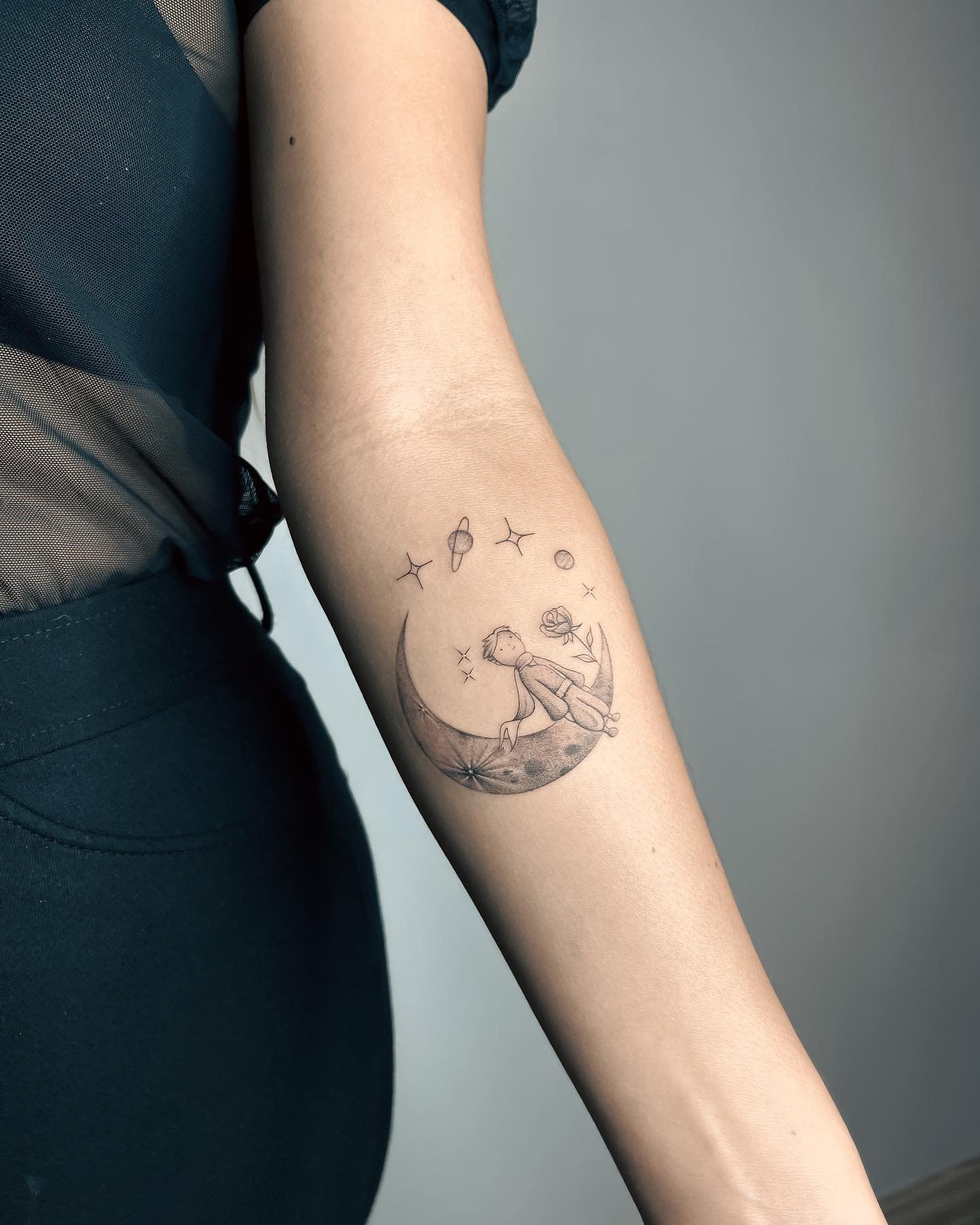 - Minimalistinis stilius yra vienas iš populiariausių variantų. Maži piešiniai su Mažojo princo siluetu, jo skrybėle ar žvaigždėmis, apjuostomis linijomis, puikiai tinka ant riešo, kulkšnies ar už ausies. Šis stilius tinka tiems, kurie mėgsta subtilius ir nepastebimus piešinius, bet nori išsaugoti svarbią prasmę.