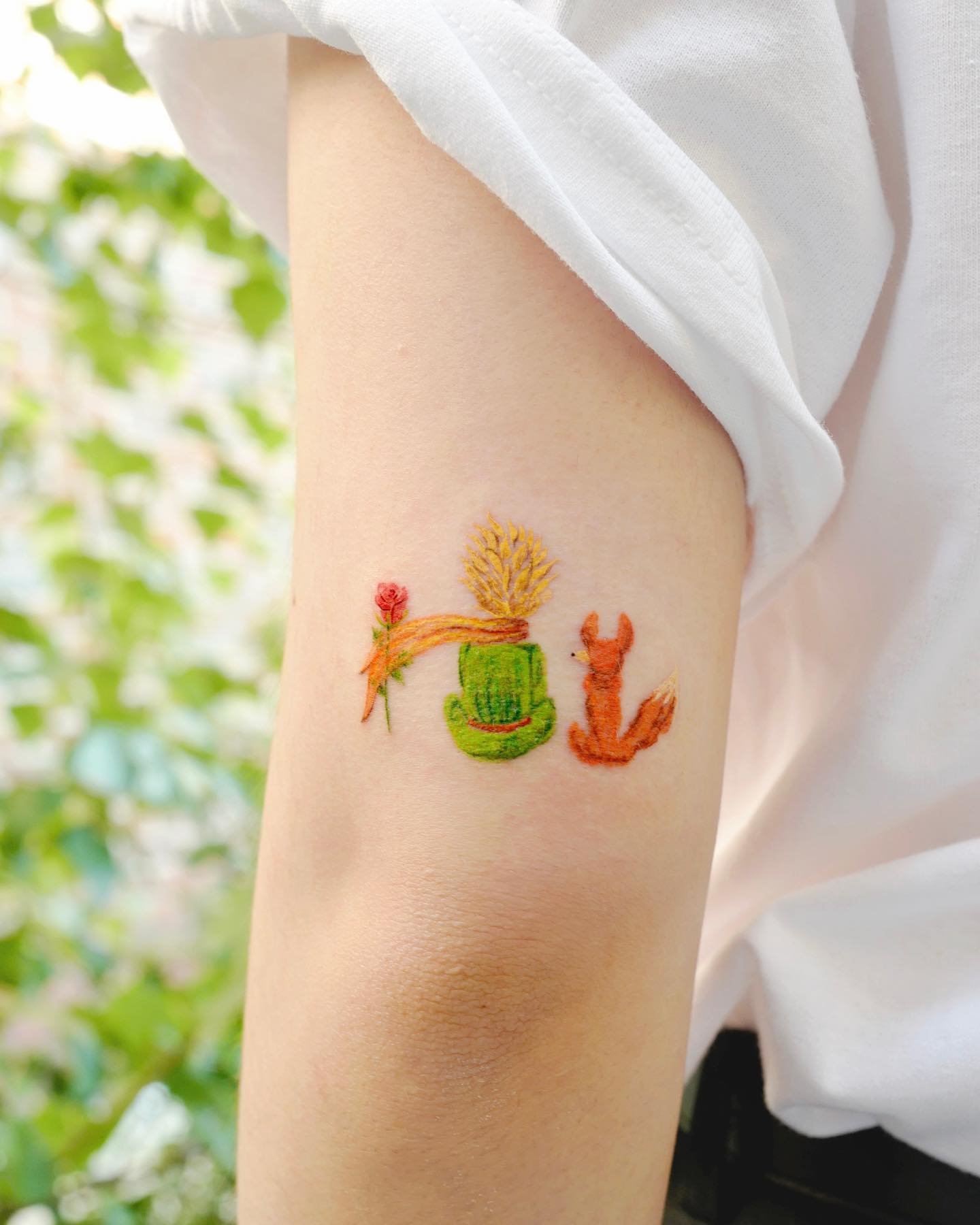 - Originalių Saint-Exupéry knygos iliustracijų atkūrimas yra kitas variantas. Ryškios spalvotos tatuiruotės su Mažojo princo atvaizdu ant planetos arba šalia Rožės gali perteikti knygos dvasią ir suteikti kasdienybei pasakų nuotaikos. Šis dizainas ypač populiarus tarp literatūros gerbėjų ir tų, kurie nori parodyti savo meilę kūriniui.