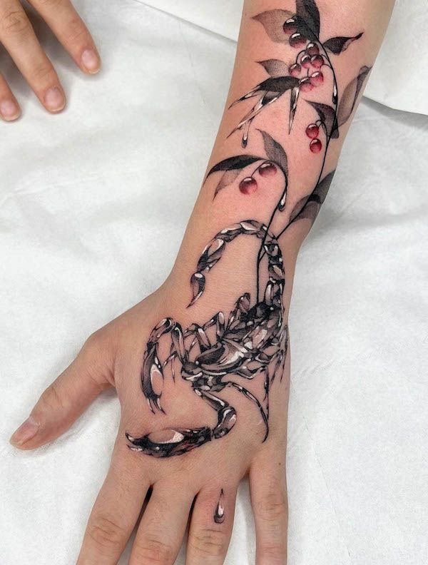 - Riešas – kompaktišką Skorpiono tatuiruotės eskizą ant riešo danai daro siekiantys laisvės, pergalės žmonės. Taikus gyvūnas ramioje pozoje reiškia romumą, saugumą.