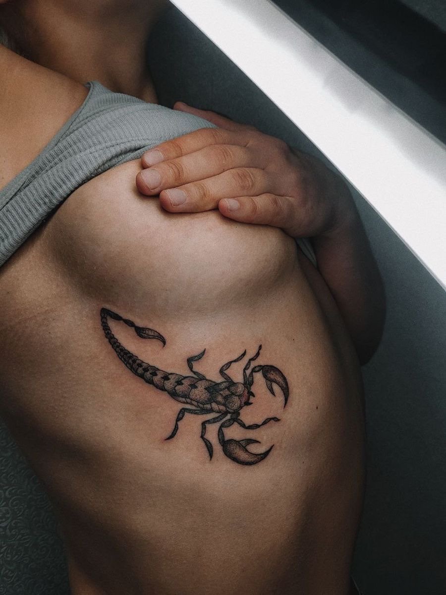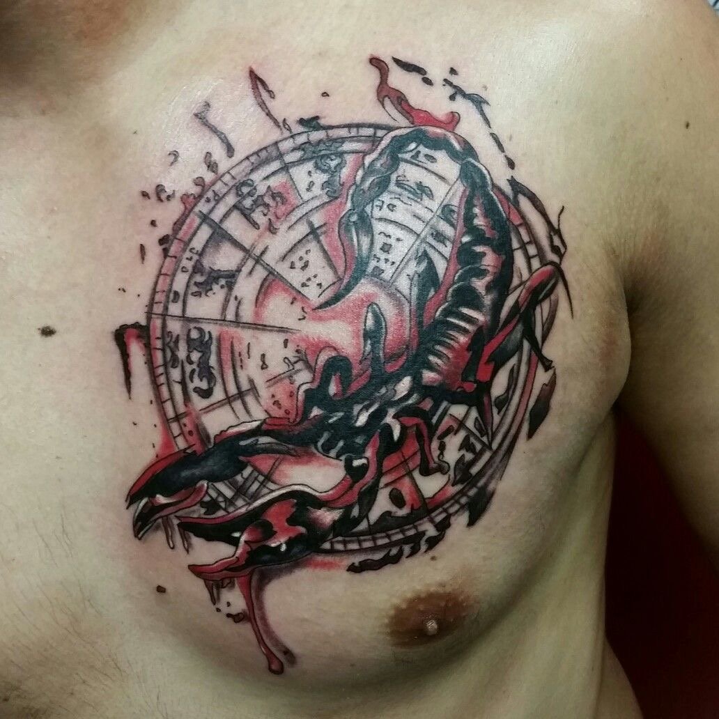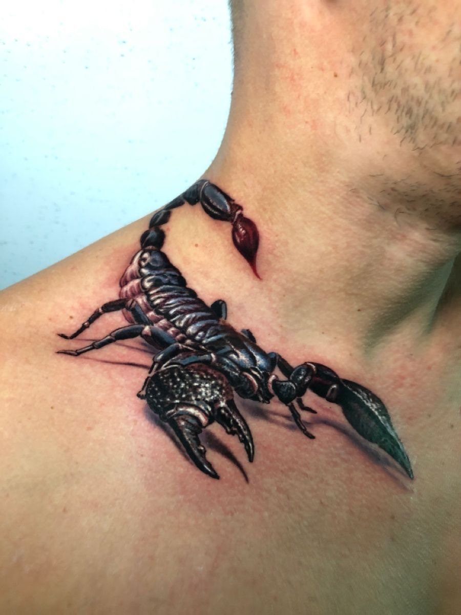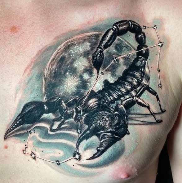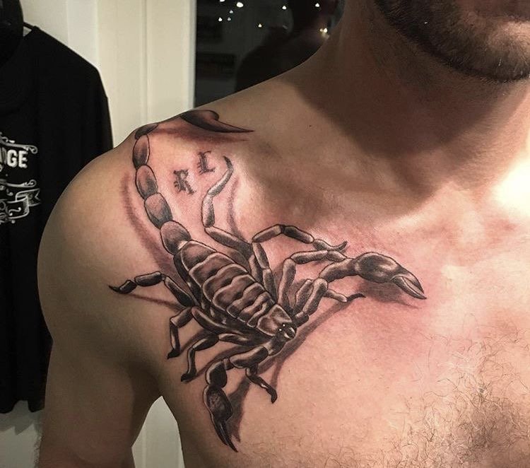 - Krūtinė – Skorpiono tatuiruotės eskizas labai patrauklus ir estetiškai atrodo po krūtine. Lygiai taip pat ir viršutinėje krūtinės dalyje po raktikauliu.